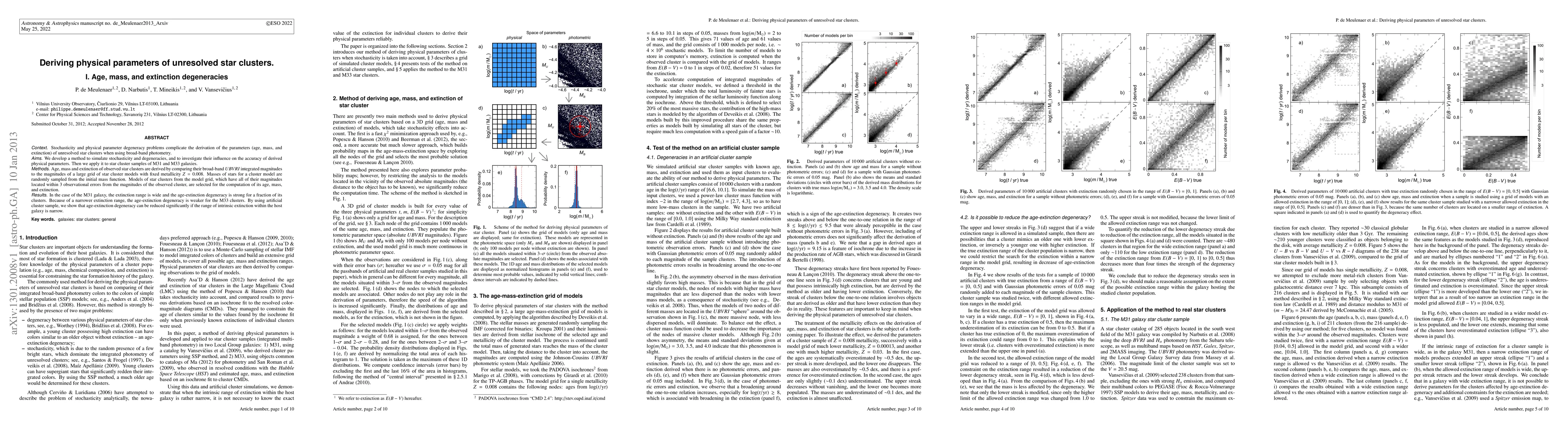 This paper develops a method to simulate and analyze the stochasticity and degeneracies affecting the derivation of age, mass, and extinction of unresolved star clusters using broad-band photometry. The method is applied to star clusters in M31 and M33, showing strong age-extinction degeneracy in M31 due to a wide extinction range, while M33 exhibits weaker degeneracy due to a narrower range.