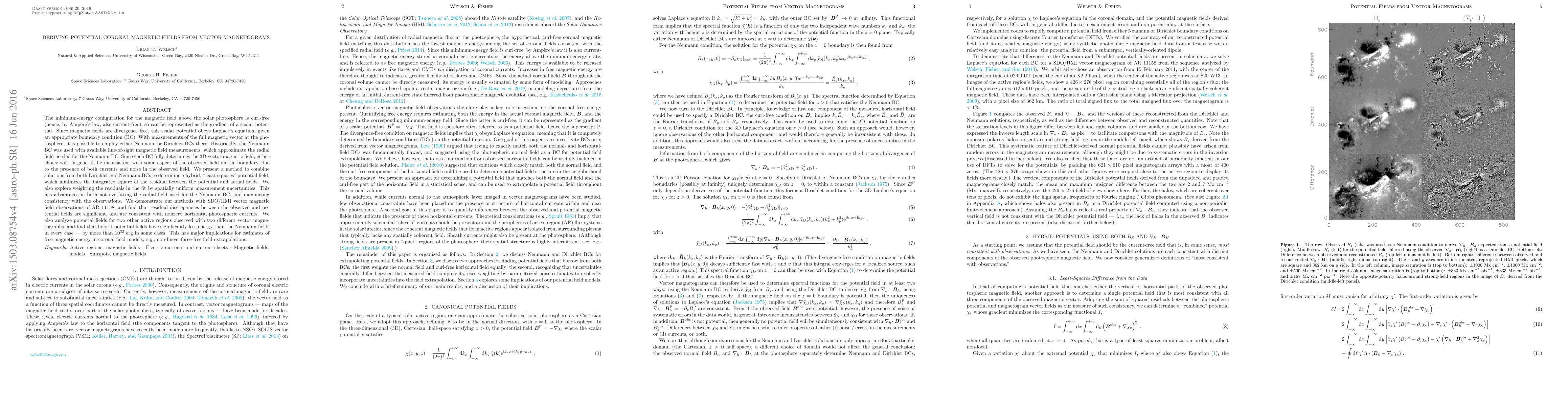 The minimum-energy configuration for the magnetic field above the solar photosphere is curl-free (hence, by Ampere's law, also current-free), so can be represented as the gradient of a scalar potential. Since magnetic fields are divergence free, this scalar potential obeys Laplace's equation, given an appropriate boundary condition (BC). With measurements of the full magnetic vector at the photosphere, it is possible to employ either Neumann or Dirichlet BCs there. Historically, the Neumann BC was used with available line-of-sight magnetic field measurements, which approximate the radial field needed for the Neumann BC. Since each BC fully determines the 3D vector magnetic field, either choice will, in general, be inconsistent with some aspect of the observed field on the boundary, due to the presence of both currents and noise in the observed field. We present a method to combine solutions from both Dirichlet and Neumann BCs to determine a hybrid, "least-squares" potential field, which minimizes the integrated square of the residual between the potential and actual fields. This has advantages in both not overfitting the radial field used for the Neumann BC, and maximizing consistency with the observations. We demonstrate our methods with SDO/HMI vector magnetic field observations of AR 11158, and find that residual discrepancies between the observed and potential fields are significant, and are consistent with nonzero horizontal photospheric currents. We also analyze potential fields for two other active regions observed with two different vector magnetographs, and find that hybrid potential fields have significantly less energy than the Neumann fields in every case --- by more than 10^(32) erg in some cases. This has major implications for estimates of free magnetic energy in coronal field models, e.g., non-linear force-free field extrapolations.