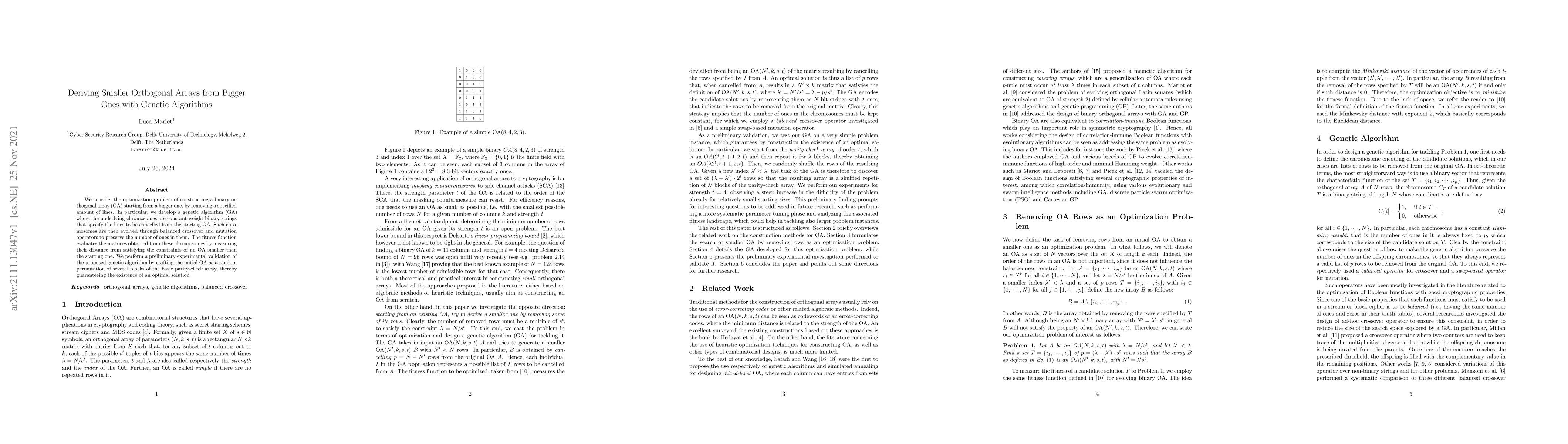 We consider the optimization problem of constructing a binary orthogonal array (OA) starting from a bigger one, by removing a specified amount of lines. In particular, we develop a genetic algorithm (GA) where the underlying chromosomes are constant-weight binary strings that specify the lines to be cancelled from the starting OA. Such chromosomes are then evolved through balanced crossover and mutation operators to preserve the number of ones in them. The fitness function evaluates the matrices obtained from these chromosomes by measuring their distance from satisfying the constraints of an OA smaller than the starting one. We perform a preliminary experimental validation of the proposed genetic algorithm by crafting the initial OA as a random permutation of several blocks of the basic parity-check array, thereby guaranteeing the existence of an optimal solution.