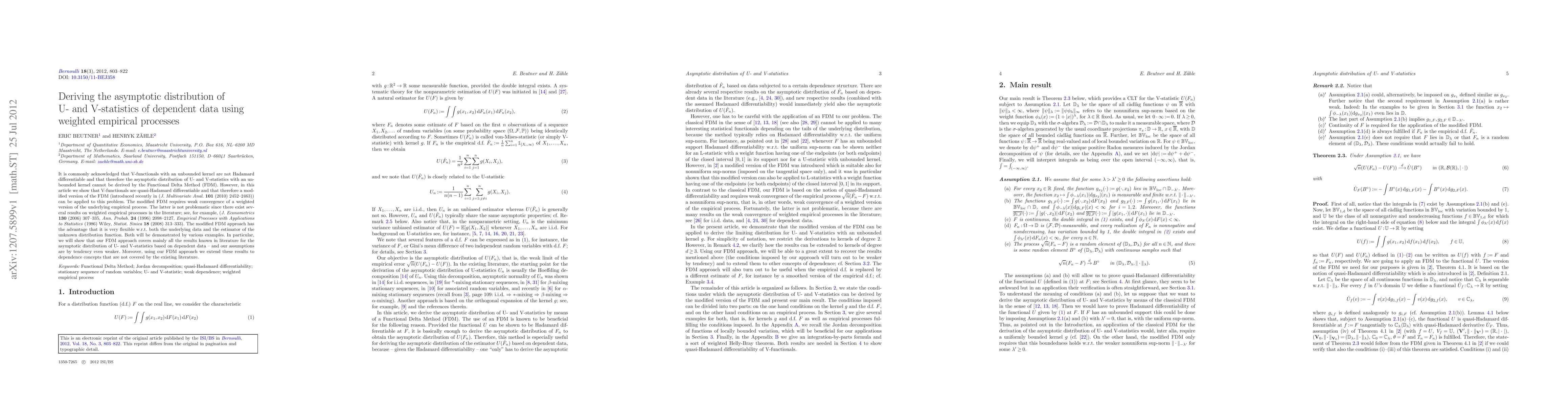 This paper demonstrates that V-functionals with unbounded kernels are quasi-Hadamard differentiable, allowing the application of a modified Functional Delta Method (FDM) to derive the asymptotic distribution of U- and V-statistics for dependent data. The approach leverages the weak convergence of weighted empirical processes, extending existing results and covering a broader range of dependence concepts.