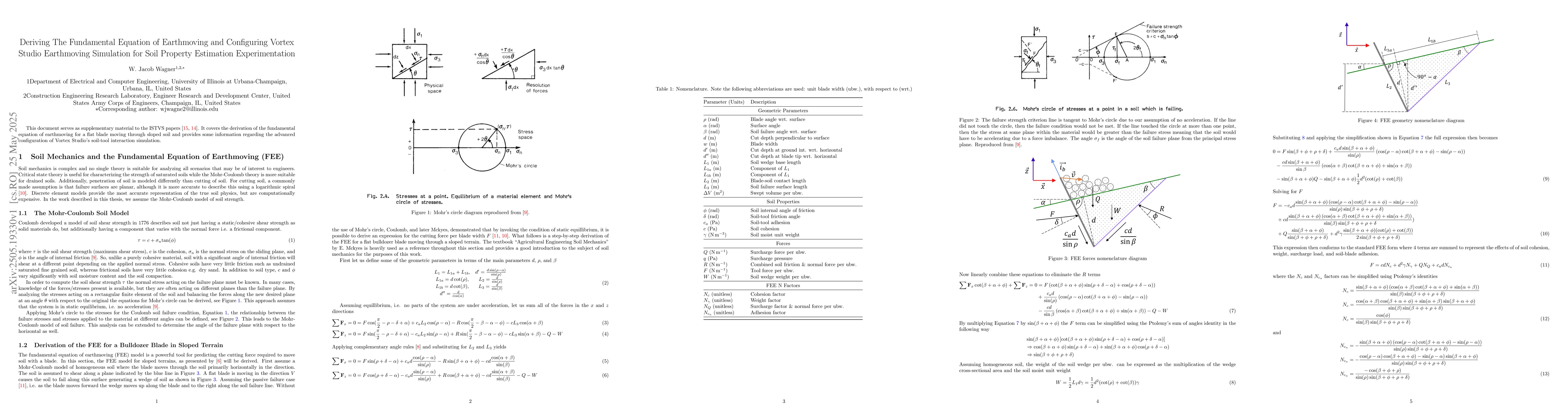 This document serves as supplementary material for two International Society for Terrain-Vehicle Systems conference publications regarding in situ soil property estimation by Wagner et al. in 2023 and 2025. It covers the derivation of the fundamental equation of earthmoving for a flat blade moving through sloped soil and provides some information regarding the advanced configuration of Vortex Studio's soil-tool interaction simulation.