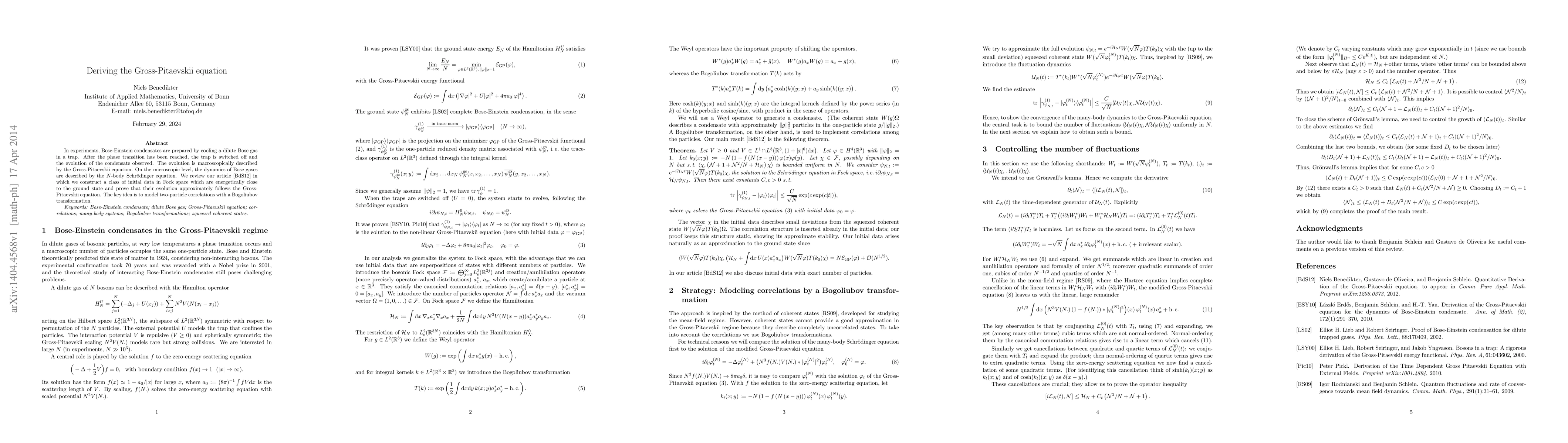 This paper reviews the derivation of the Gross-Pitaevskii equation from the $N$-body Schrödinger equation for Bose-Einstein condensates. The authors construct initial data close to the ground state and demonstrate that their evolution approximates the Gross-Pitaevskii equation, using a Bogoliubov transformation to model two-particle correlations.