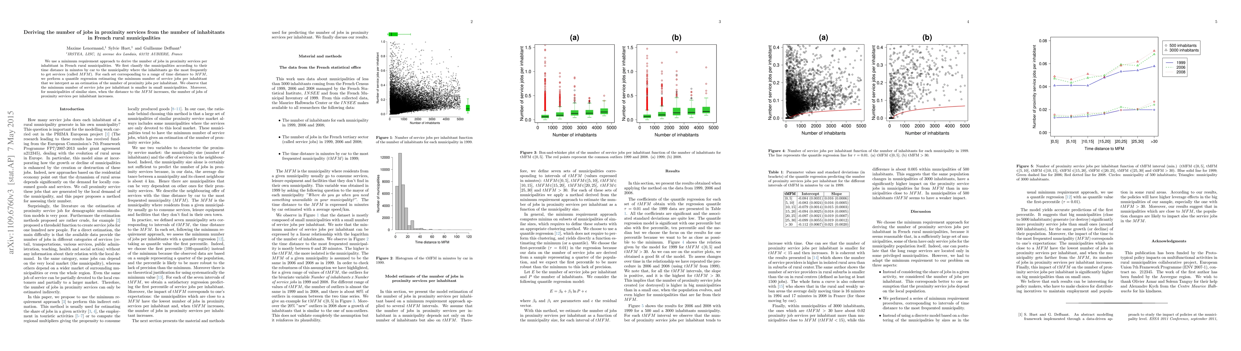 We use a minimum requirement approach to derive the number of jobs in proximity services per inhabitant in French rural municipalities. We first classify the municipalities according to their time distance to the municipality where the inhabitants go the most frequently to get services (called MFM). For each set corresponding to a range of time distance to MFM, we perform a quantile regression estimating the minimum number of service jobs per inhabitant, that we interpret as an estimation of the number of proximity jobs per inhabitant. We observe that the minimum number of service jobs per inhabitant is smaller in small municipalities. Moreover, for municipalities of similar sizes, when the distance to the MFM increases, we find that the number of jobs of proximity services per inhabitant increases.