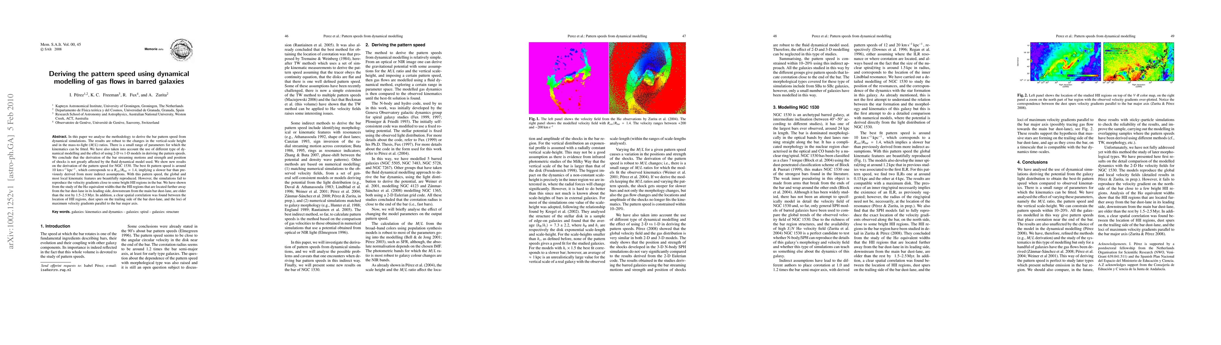 In this paper we analyse the methodology to derive the bar pattern speed from dynamical simulations. The results are robust to the changes in the vertical-scale height and in the mass-to-light (M/L) ratios. There is a small range of parameters for which the kinematics can be fitted. We have also taken into account the use of different type of dynamical modelling and the effect of using 2-D vs 1-D models in deriving the pattern speeds. We conclude that the derivation of the bar streaming motions and strength and position of shocks is not greatly affected by the fluid dynamical model used. We show new results on the derivation of the pattern speed for NGC 1530. The best fit pattern speed is around 10 km/s/kpc, which corresponds to a R_cor/R_bar = 1.4, implying a slower bar than previously derived from more indirect assumptions. With this pattern speed, the global and most local kinematic features are beautifully reproduced. However, the simulations fail to reproduce the velocity gradients close to some bright HII regions in the bar. We have shown from the study of the Halpha equivalent widths that the HII regions that are located further away from the bar dust-lane in its leading side, downstream from the main bar dust-lane, are older than the rest by 1.5-2.5 Myr. In addition, a clear spatial correlation was found between the location of HII regions, dust spurs on the trailing side of the bar dust-lane, and the loci of maximum velocity gradients parallel to the bar major axis.