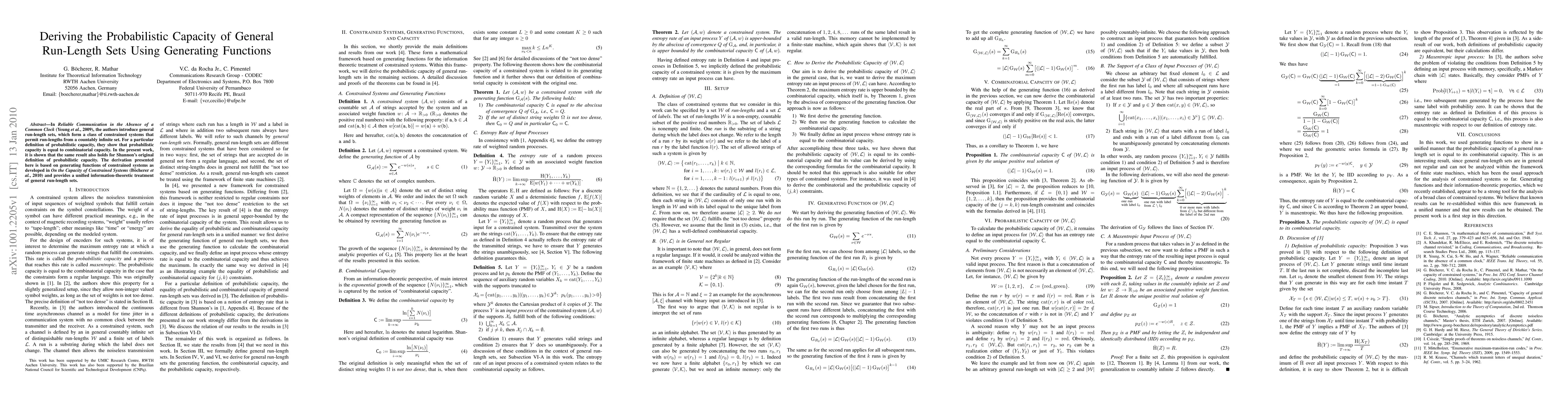 In "Reliable Communication in the Absence of a Common Clock" (Yeung et al., 2009), the authors introduce general run-length sets, which form a class of constrained systems that permit run-lengths from a countably infinite set. For a particular definition of probabilistic capacity, they show that probabilistic capacity is equal to combinatorial capacity. In the present work, it is shown that the same result also holds for Shannon's original definition of probabilistic capacity. The derivation presented here is based on generating functions of constrained systems as developed in "On the Capacity of Constrained Systems" (Boecherer et al., 2010) and provides a unified information-theoretic treatment of general run-length sets.
