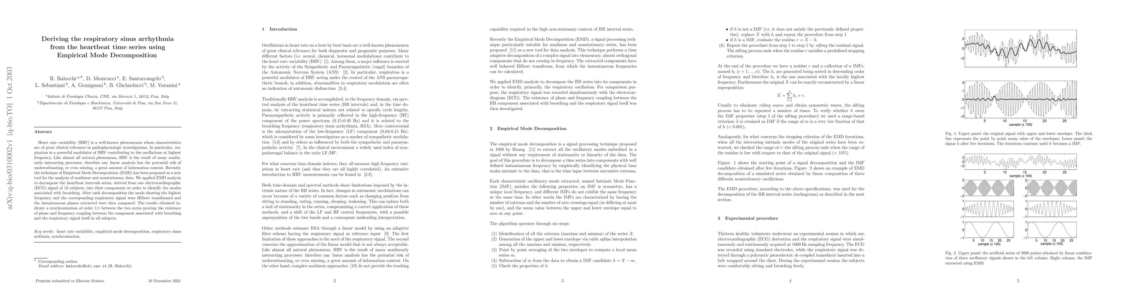 This study applies Empirical Mode Decomposition (EMD) to electrocardiographic (ECG) signals to analyze heart rate variability (HRV) and identify respiratory sinus arrhythmia. The results show a 1:1 synchronization between the highest frequency component and the respiratory signal, indicating phase and frequency coupling in all subjects.