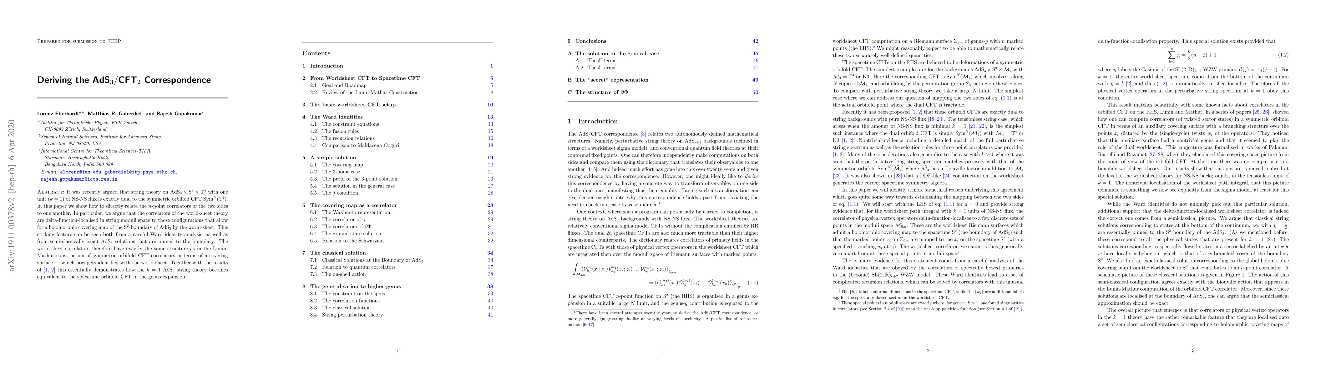 It was recently argued that string theory on ${\rm AdS}_3\times {\rm S}^3\times \mathbb{T}^4$ with one unit ($k=1$) of NS-NS flux is exactly dual to the symmetric orbifold CFT ${\rm Sym}^N(\mathbb{T}^4)$. In this paper we show how to directly relate the $n$-point correlators of the two sides to one another. In particular, we argue that the correlators of the world-sheet theory are delta-function-localised in string moduli space to those configurations that allow for a holomorphic covering map of the $\text{S}^2$-boundary of $\text{AdS}_3$ by the world-sheet. This striking feature can be seen both from a careful Ward identity analysis, as well as from semi-classically exact AdS$_3$ solutions that are pinned to the boundary. The world-sheet correlators therefore have exactly the same structure as in the Lunin-Mathur construction of symmetric orbifold CFT correlators in terms of a covering surface -- which now gets identified with the world-sheet. Together with the results of arXiv:1803.04423 and arXiv:1812.01007 this essentially demonstrates how the $k=1$ $\text{AdS}_3$ string theory becomes equivalent to the spacetime orbifold CFT in the genus expansion.