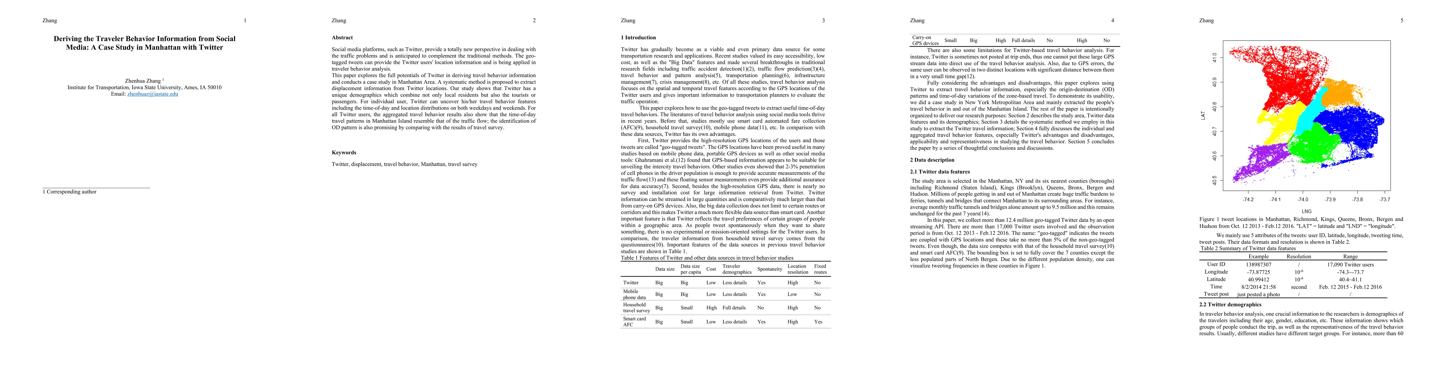 Social media platforms, such as Twitter, provide a totally new perspective in dealing with the traffic problems and is anticipated to complement the traditional methods. The geo-tagged tweets can provide the Twitter users' location information and is being applied in traveler behavior analysis. This paper explores the full potentials of Twitter in deriving travel behavior information and conducts a case study in Manhattan Area. A systematic method is proposed to extract displacement information from Twitter locations. Our study shows that Twitter has a unique demographics which combine not only local residents but also the tourists or passengers. For individual user, Twitter can uncover his/her travel behavior features including the time-of-day and location distributions on both weekdays and weekends. For all Twitter users, the aggregated travel behavior results also show that the time-of-day travel patterns in Manhattan Island resemble that of the traffic flow; the identification of OD pattern is also promising by comparing with the results of travel survey.