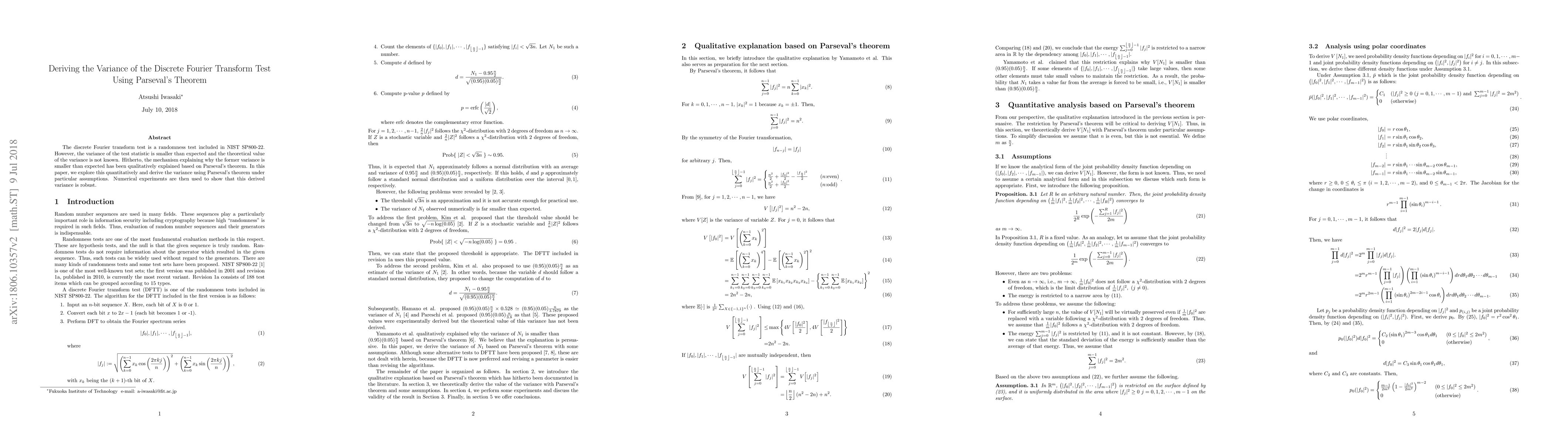 This paper derives the variance of the discrete Fourier transform test statistic from NIST SP800-22 using Parseval's theorem under specific assumptions, providing a quantitative explanation for the observed smaller-than-expected variance, and validates the derived variance through numerical experiments.