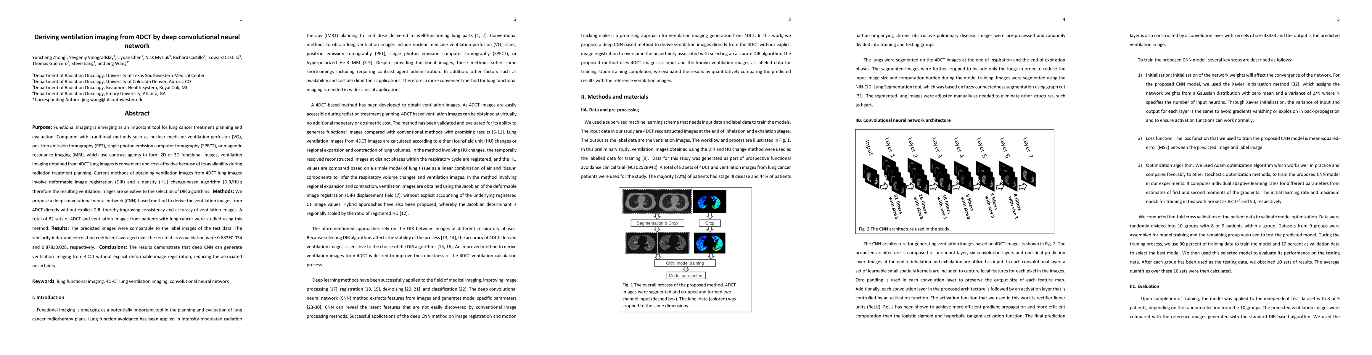 This paper proposes a deep convolutional neural network (CNN) method to derive ventilation images from 4DCT lung scans directly, eliminating the need for deformable image registration (DIR). The results indicate that the CNN-based approach provides consistent and accurate ventilation images comparable to those obtained via traditional DIR/HU methods, demonstrating potential for improved consistency and accuracy in lung cancer treatment planning.