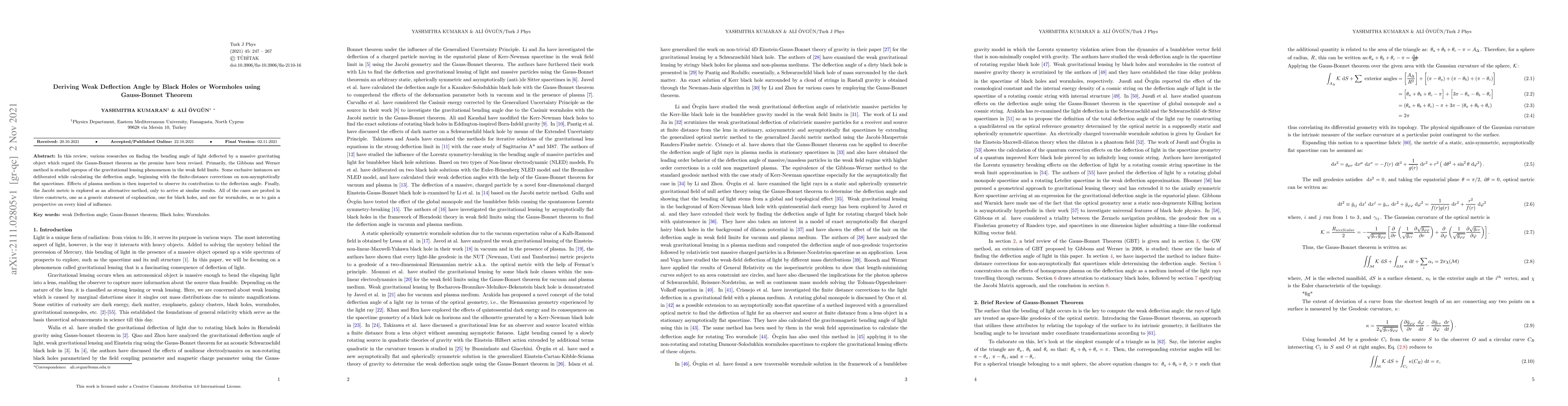 In this review, various researches on finding the bending angle of light deflected by a massive gravitating object which regard the Gauss-Bonnet theorem as the premise have been revised. Primarily, the Gibbons and Werner method is studied apropos of the gravitational lensing phenomenon in the weak field limits. Some exclusive instances are deliberated while calculating the deflection angle, beginning with the finite-distance corrections on non-asymptotically flat spacetimes. Effects of plasma medium is then inspected to observe its contribution to the deflection angle. Finally, the Jacobi metric is explored as an alternative method, only to arrive at similar results. All of the cases are probed in three constructs, one as a generic statement of explanation, one for black holes, and one for wormholes, so as to gain a perspective on every kind of influence.