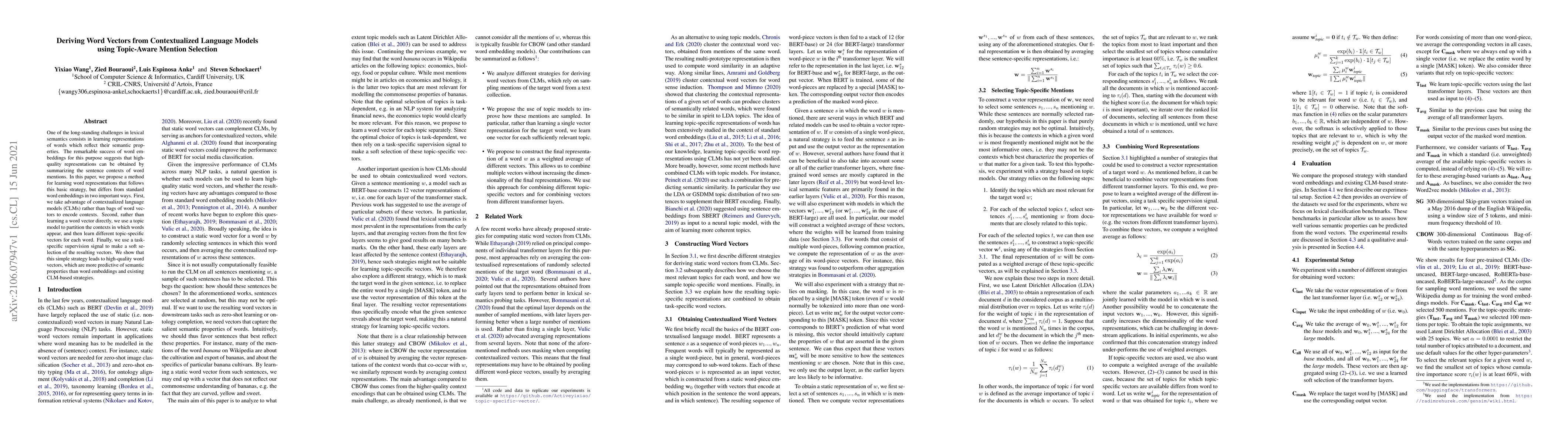 This paper proposes a method to derive word vectors using contextualized language models and topic-aware mention selection, resulting in representations that better reflect semantic properties compared to traditional word embeddings. The approach leverages topic-specific vectors and task-specific supervision for improved predictive accuracy.