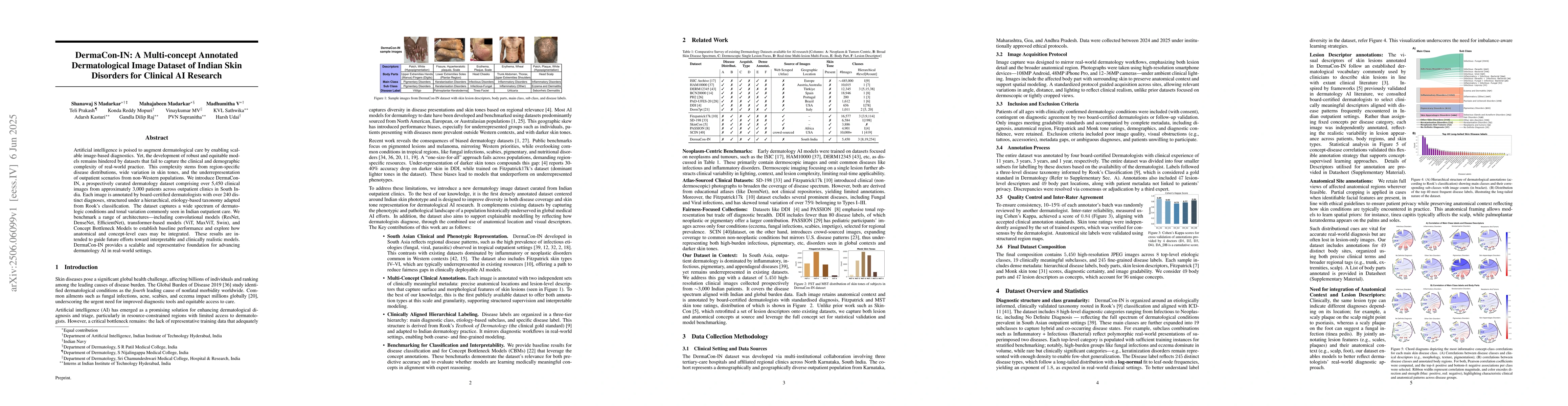 Artificial intelligence is poised to augment dermatological care by enabling scalable image-based diagnostics. Yet, the development of robust and equitable models remains hindered by datasets that fail to capture the clinical and demographic complexity of real-world practice. This complexity stems from region-specific disease distributions, wide variation in skin tones, and the underrepresentation of outpatient scenarios from non-Western populations. We introduce DermaCon-IN, a prospectively curated dermatology dataset comprising over 5,450 clinical images from approximately 3,000 patients across outpatient clinics in South India. Each image is annotated by board-certified dermatologists with over 240 distinct diagnoses, structured under a hierarchical, etiology-based taxonomy adapted from Rook's classification. The dataset captures a wide spectrum of dermatologic conditions and tonal variation commonly seen in Indian outpatient care. We benchmark a range of architectures including convolutional models (ResNet, DenseNet, EfficientNet), transformer-based models (ViT, MaxViT, Swin), and Concept Bottleneck Models to establish baseline performance and explore how anatomical and concept-level cues may be integrated. These results are intended to guide future efforts toward interpretable and clinically realistic models. DermaCon-IN provides a scalable and representative foundation for advancing dermatology AI in real-world settings.