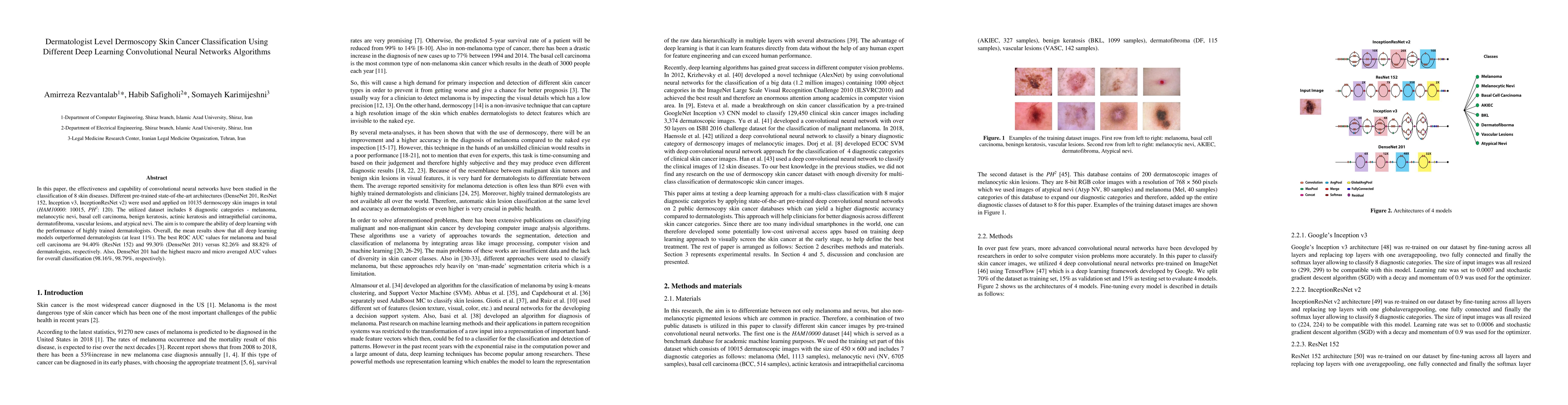 This paper evaluates the performance of various deep learning convolutional neural networks in classifying 8 skin diseases using dermoscopy images. The study shows that all deep learning models, especially DenseNet 201 and ResNet 152, outperform dermatologists, achieving higher ROC AUC values for melanoma and basal cell carcinoma.