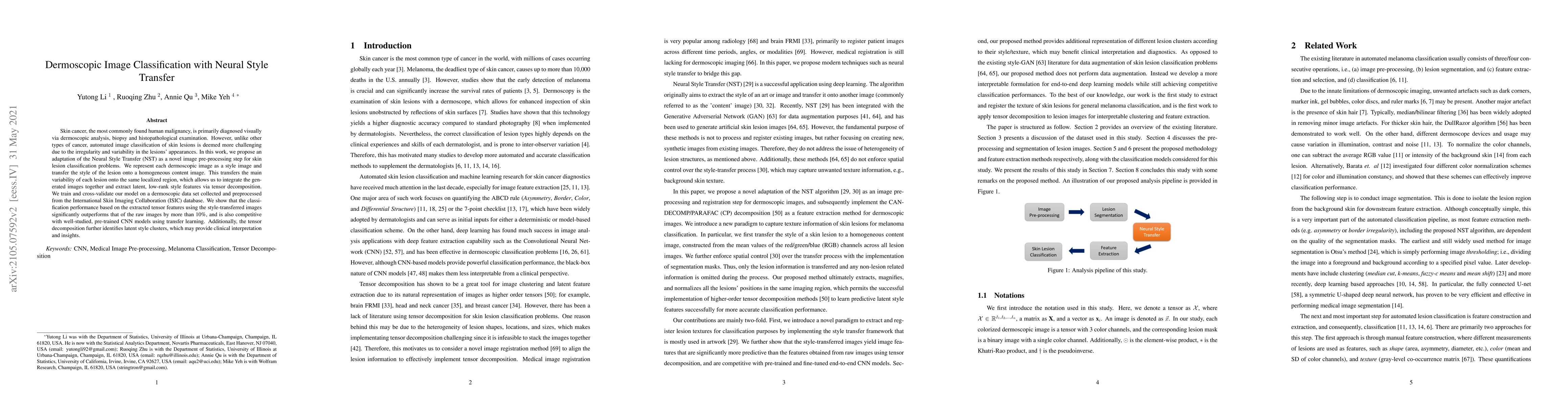 This paper proposes using Neural Style Transfer as a pre-processing step to enhance dermoscopic image classification for skin cancer detection. The style-transferred images reveal latent, low-rank features that improve classification performance by over 10% compared to raw images, rivaling pre-trained CNN models.