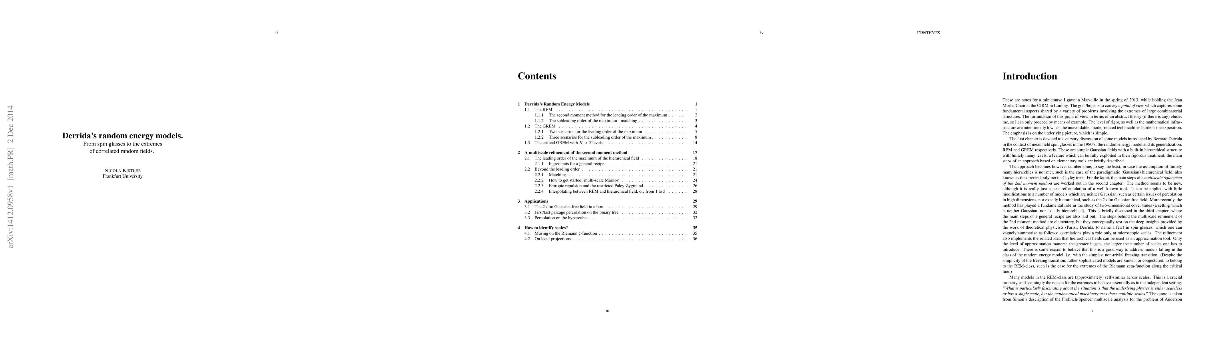 This paper provides a detailed exploration of correlated random fields, starting with Derrida's random energy models in spin glasses, and advancing through multi-scale refinements to analyze complex systems like Gaussian hierarchical fields. It concludes with applications to Gaussian free fields and percolation issues, along with a method for constructing scales from first principles.