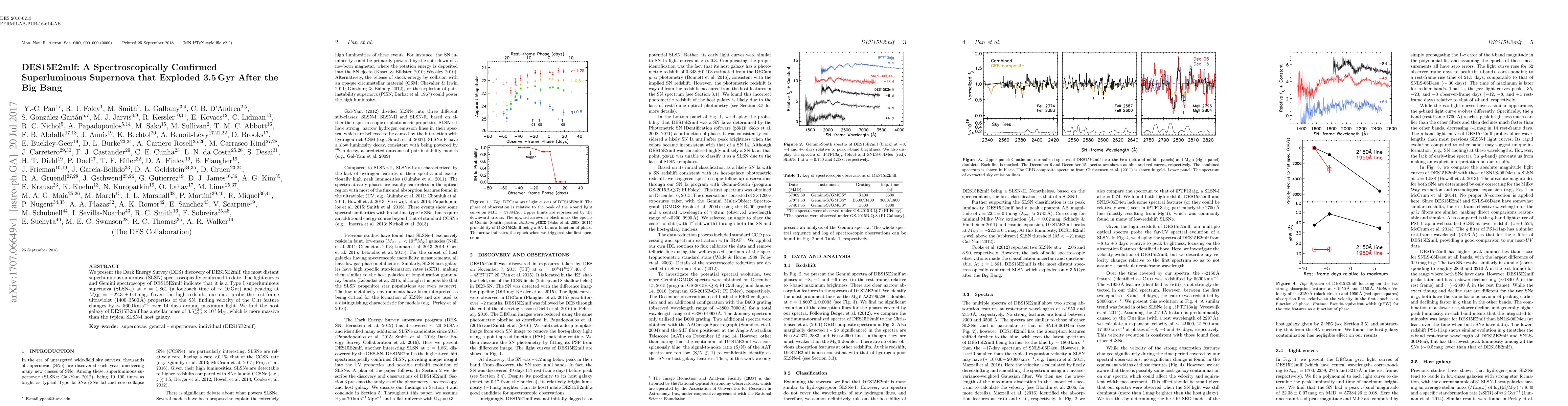 The Dark Energy Survey discovered DES15E2mlf, the most distant superluminous supernova confirmed to date, at z = 1.861 (10 Gyr lookback time), peaking at -22.3 mag. It's a Type I SLSN-I with UV spectral data showing a C III velocity change of ~5600 km/s. The host galaxy is more massive (3.5 x 10^9 M_sun) than typical SLSN-I hosts.