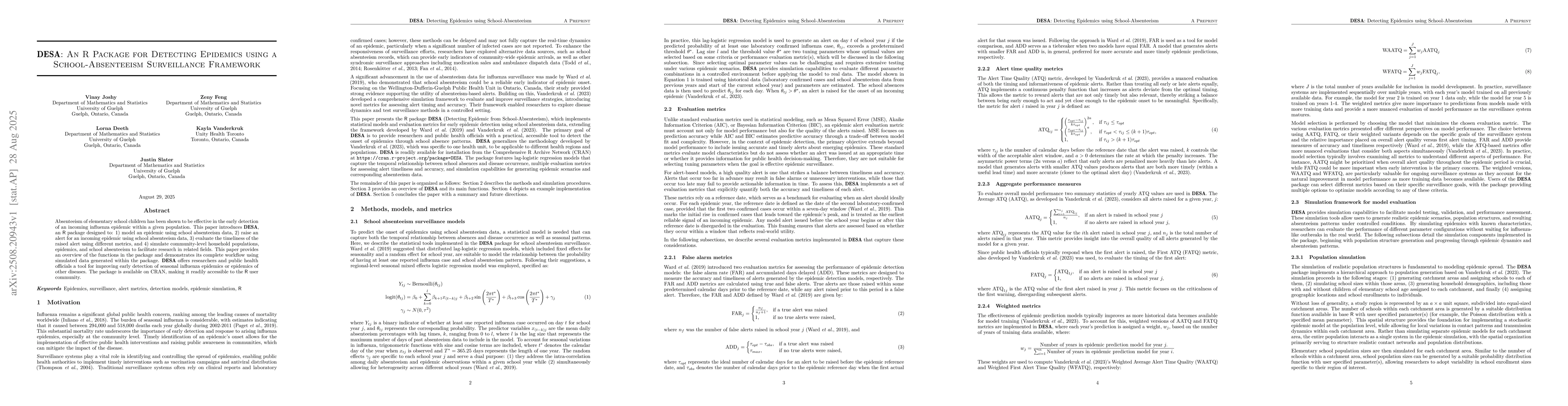Absenteeism of elementary school children has been shown to be effective in the early detection of an incoming influenza epidemic within a given population. This paper introduces DESA, an R package designed to: 1) model an epidemic using school absenteeism data, 2) raise an alert for an incoming epidemic using school absenteeism data, 3) evaluate the timeliness of the raised alert using different metrics, and 4) simulate community-level household populations, epidemics, and school absenteeism to facilitate research in related fields. This paper provides an overview of the functions in the package and demonstrates its complete workflow using simulated data generated within the package. DESA offers researchers and public health officials a tool for improving early detection of seasonal influenza epidemics or epidemics of other diseases. The package is available on CRAN, making it readily accessible to the R user community.