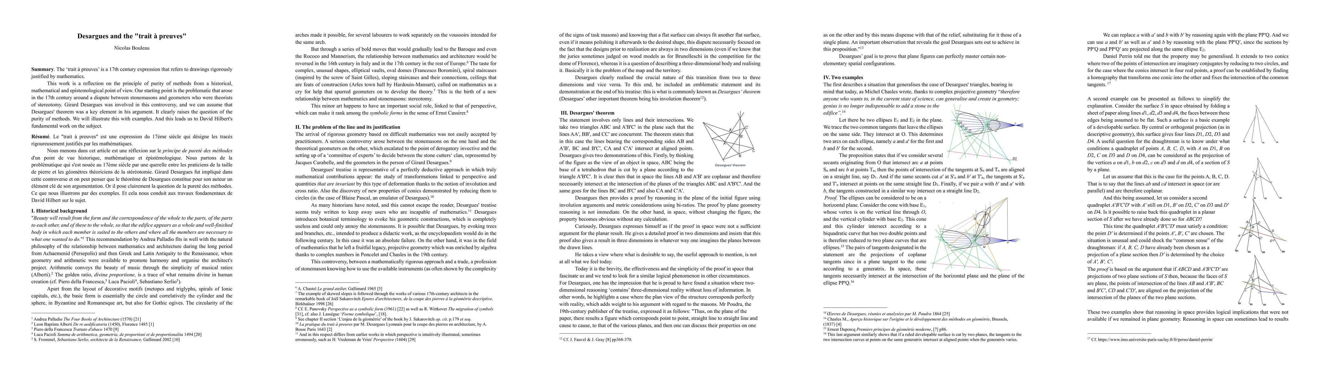 This paper explores how 17th-century mathematician Girard Desargues' work on geometry led to a discussion about the purity of methods in mathematics. It highlights how this concept remains relevant today through the lens of David Hilbert's fundamental work.