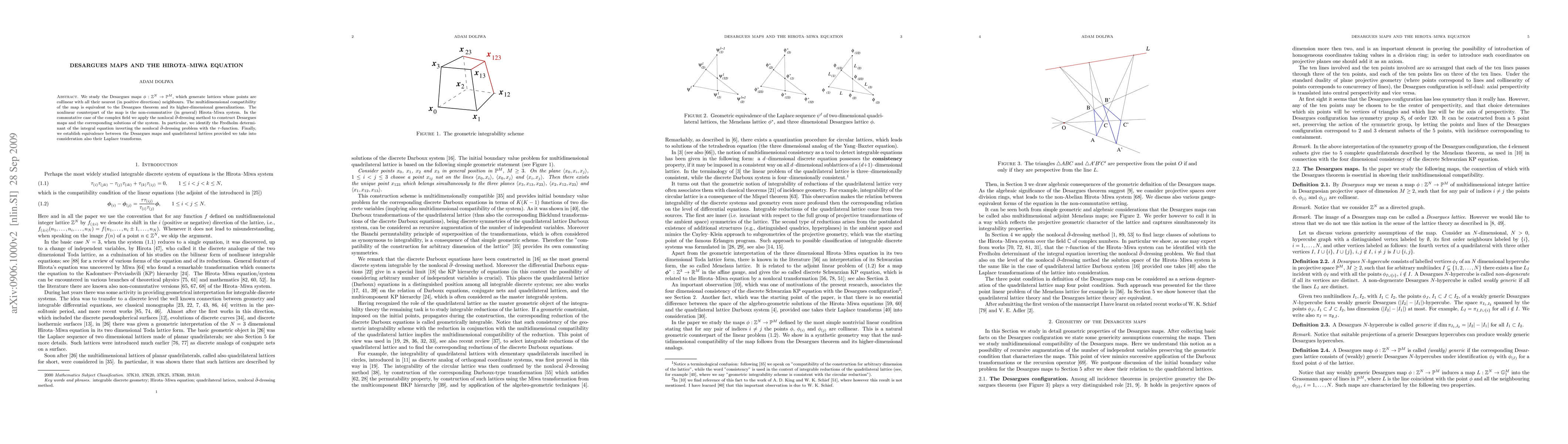 We study the Desargues maps $\phi:\ZZ^N\to\PP^M$, which generate lattices whose points are collinear with all their nearest (in positive directions) neighbours. The multidimensional compatibility of the map is equivalent to the Desargues theorem and its higher-dimensional generalizations. The nonlinear counterpart of the map is the non-commutative (in general) Hirota--Miwa system. In the commutative case of the complex field we apply the nonlocal $\bar\partial$-dressing method to construct Desargues maps and the corresponding solutions of the equation. In particular, we identify the Fredholm determinant of the integral equation inverting the nonlocal $\bar\partial$-dressing problem with the $\tau$-function. Finally, we establish equivalence between the Desargues maps and quadrilateral lattices provided we take into consideration also their Laplace transforms.