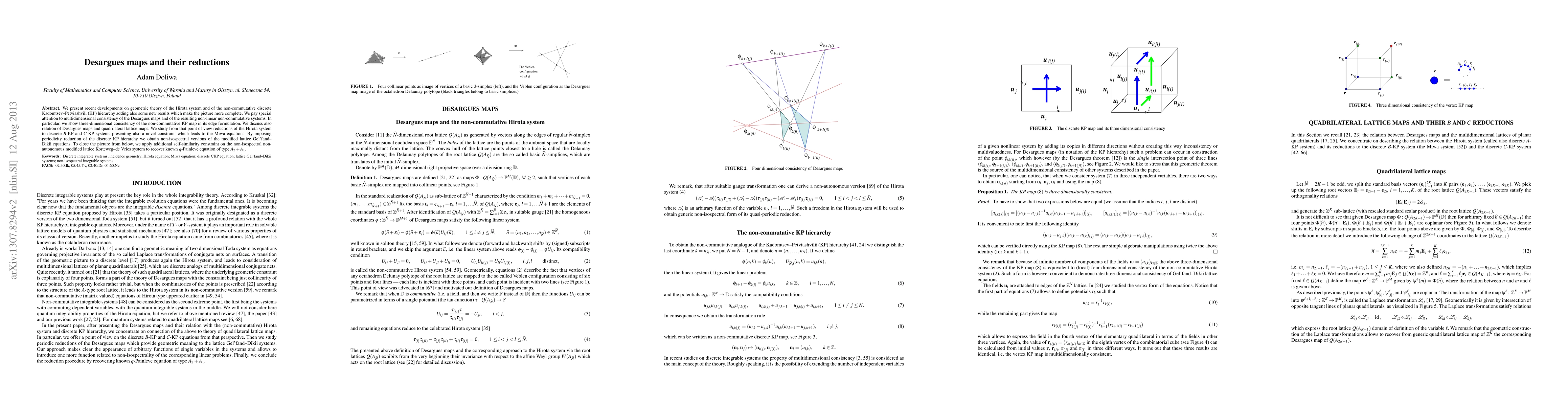 We present recent developments on geometric theory of the Hirota system and of the non-commutative discrete Kadomtsev-Petviashvili (KP) hierarchy adding also some new results which make the picture more complete. We pay special attention to multidimensional consistency of the Desargues maps and of the resulting non-linear non-commutative systems. In particular, we show three-dimensional consistency of the non-commutative KP map in its edge formulation. We discuss also relation of Desargues maps and quadrilateral lattice maps. We study from that point of view reductions of the Hirota system to discrete B-KP and C-KP systems presenting also a novel constraint which leads to the Miwa equations. By imposing periodicity reduction of the discrete KP hierarchy we obtain non-isospectral versions of the modified lattice Gel'fand-Dikii equations. To close the picture from below, we apply additional self-similarity constraint on the non-isospectral non-autonomous modified lattice Korteweg-de Vries system to recover known q-Painleve equation of type A_2+A_1.
