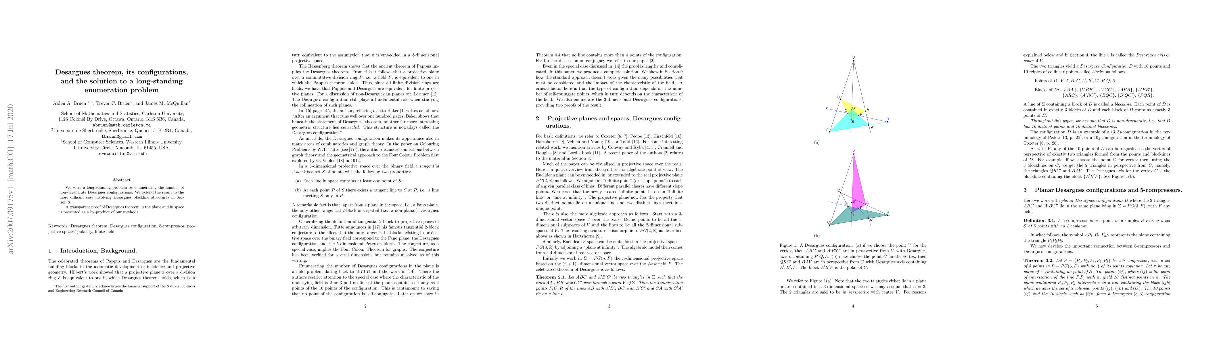 This work is significant as it resolves a long-standing enumeration problem, provides a clear proof of Desargues' theorem, and extends the findings to more intricate geometric structures, contributing to the theoretical understanding of projective geometry.