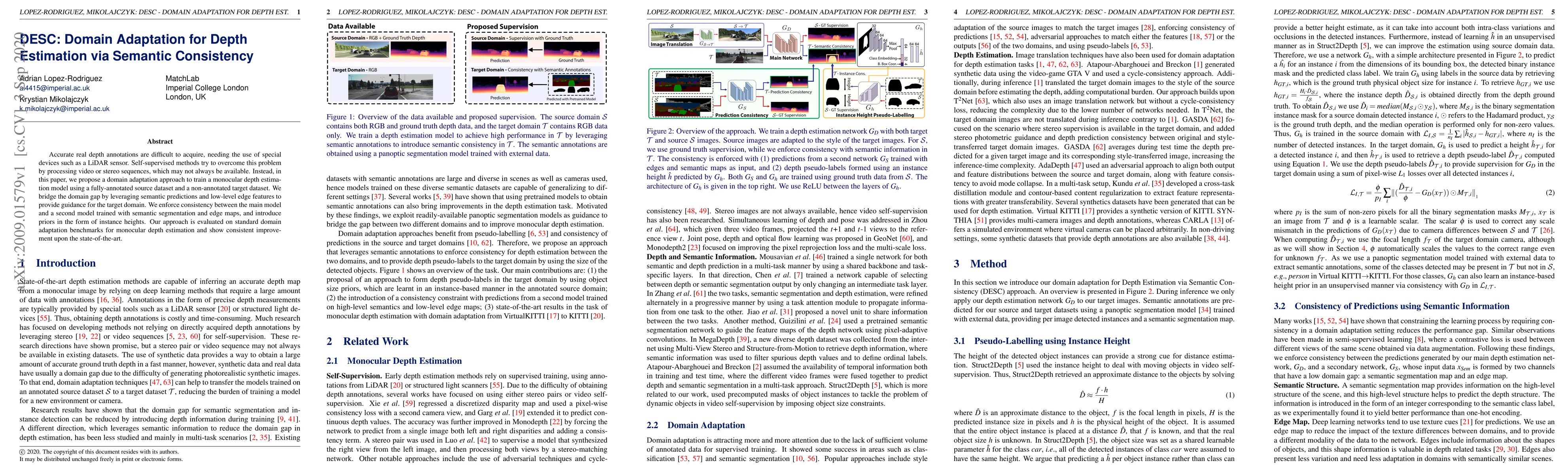 This paper proposes a domain adaptation method for monocular depth estimation using semantic consistency, leveraging fully-annotated source data and non-annotated target data. It bridges the domain gap through semantic predictions and edge features, enforcing consistency between main and auxiliary models, and achieves state-of-the-art results on benchmarks.