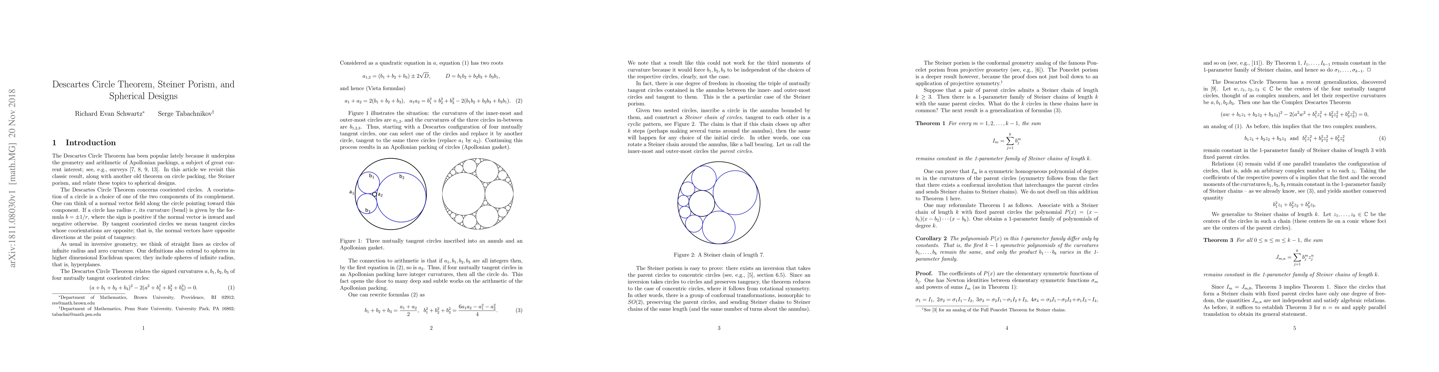 The extension of Descartes Circle Theorem to Steiner chains in spherical and hyperbolic geometries, along with the related theorem on spherical designs.