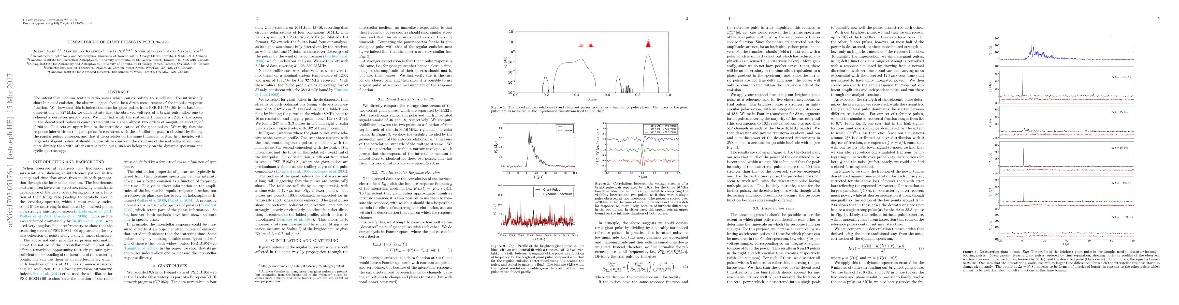 Researchers found that giant pulses from PSR B1957+20 can be used to measure the scattering timescale of interstellar medium, setting an upper limit on the intrinsic duration of the pulses.