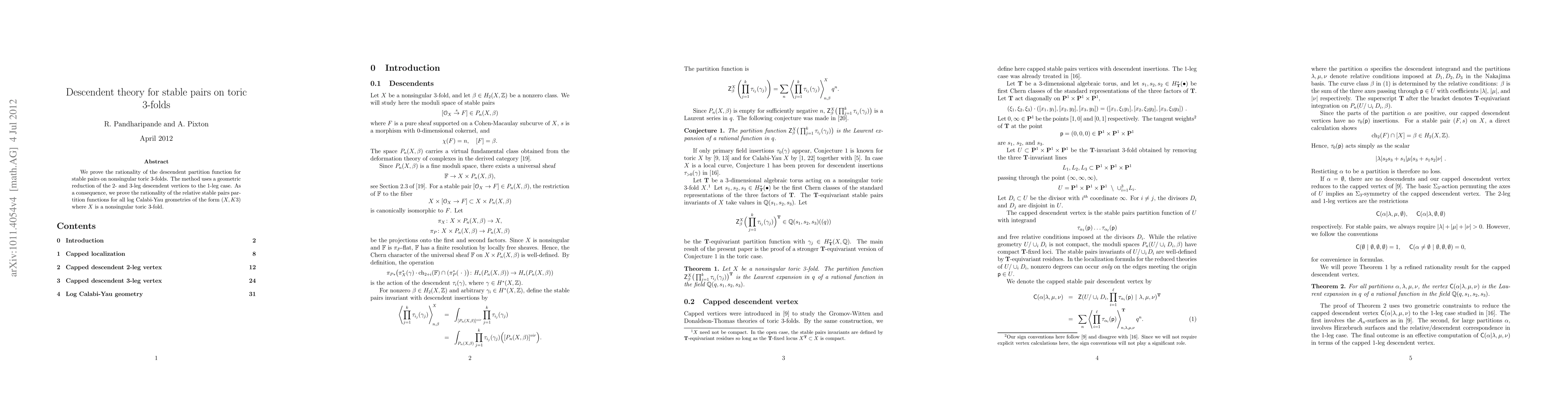 This paper proves the rationality of the descendent partition function for stable pairs on nonsingular toric 3-folds using geometric reduction techniques. It also establishes the rationality of relative stable pairs partition functions for all log Calabi-Yau geometries of the form (X, K3), where X is a nonsingular toric 3-fold.