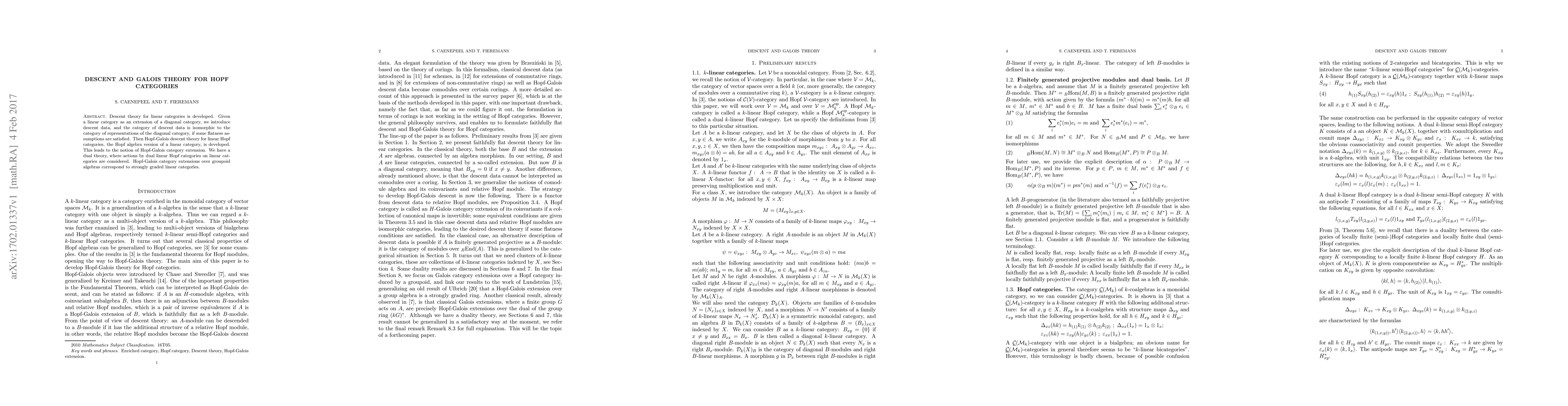 Descent theory for linear categories is developed. Given a linear category as an extension of a diagonal category, we introduce descent data, and the category of descent data is isomorphic to the category of representations of the diagonal category, if some flatness assumptions are satisfied. Then Hopf-Galois descent theory for linear Hopf categories, the Hopf algebra version of a linear category, is developed. This leads to the notion of Hopf-Galois category extension. We have a dual theory, where actions by dual linear Hopf categories on linear categories are considered. Hopf-Galois category extensions over groupoid algebras correspond to strongly graded linear categories.