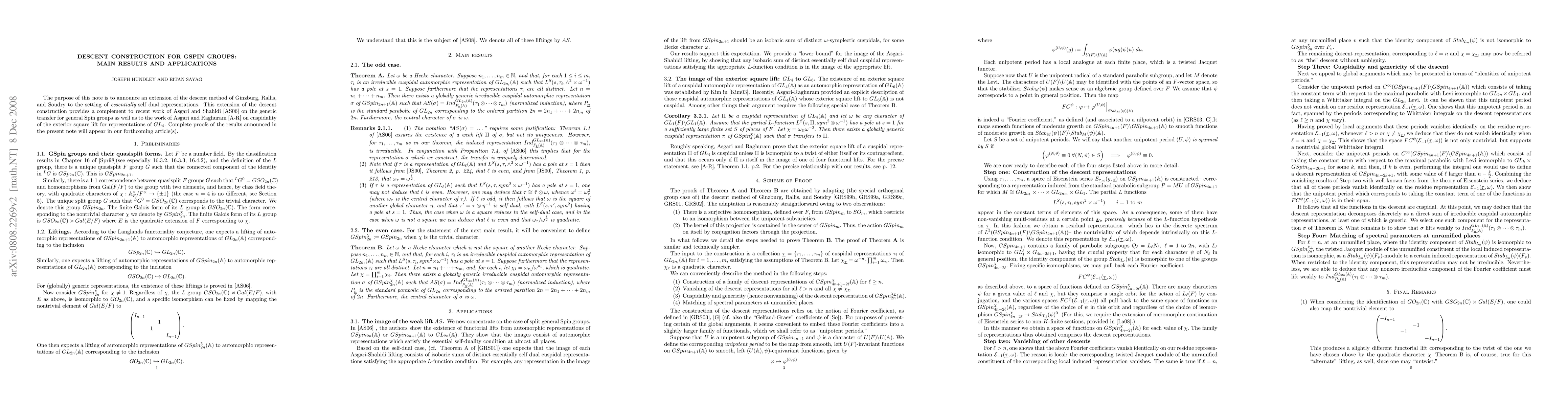 The purpose of this note is to announce an extension of the descent method of Ginzburg, Rallis and Soudry to the setting of essentially self dual representations. This extension of the descent construction provides a complement to recent work of Asgari and Shahidi on the generic transfer for general Spin groups as well as to the work of Asgari and Raghuram on cuspidality of the exterior square lift for representations of GL4. Complete proofs of the results announced in the present note will appear in our forthcoming articles.