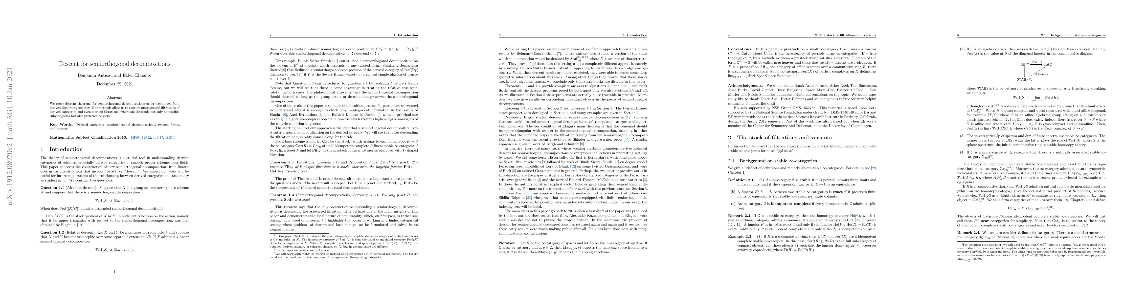 We prove descent theorems for semiorthogonal decompositions using techniques from derived algebraic geometry. Our methods allow us to capture more general filtrations of derived categories and even marked filtrations, where one descends not only admissible subcategories but also preferred objects.
