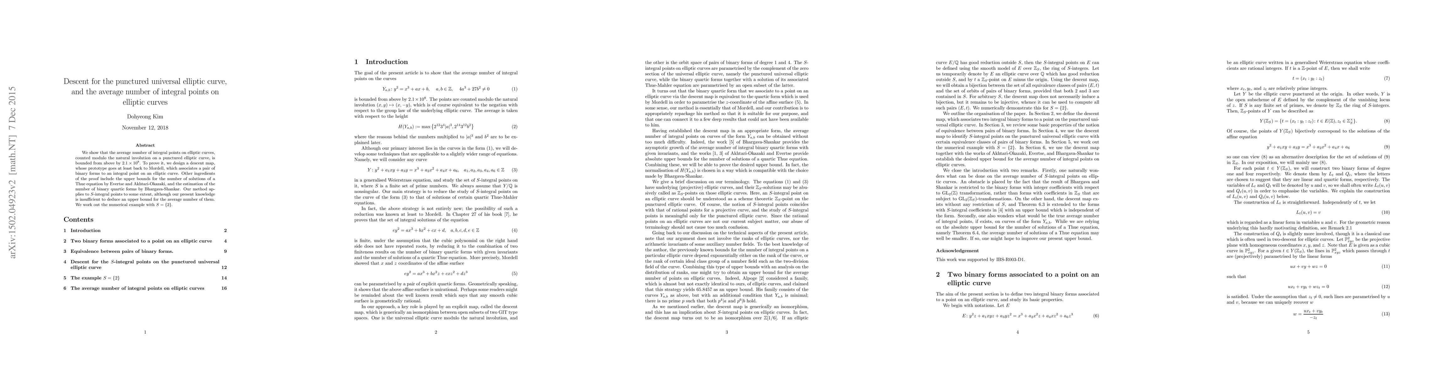 We show that the average number of integral points on elliptic curves, counted modulo the natural involution on a punctured elliptic curve, is bounded from above by $2.1 \times 10^8$. To prove it, we design a descent map, whose prototype goes at least back to Mordell, which associates a pair of binary forms to an integral point on an elliptic curve. Other ingredients of the proof include the upper bounds for the number of solutions of a Thue equation by Evertse and Akhtari-Okazaki, and the estimation of the number of binary quartic forms by Bhargava-Shankar. Our method applies to $S$-integral points to some extent, although our present knowledge is insufficient to deduce an upper bound for the average number of them. We work out the numerical example with $S=\{2\}$.