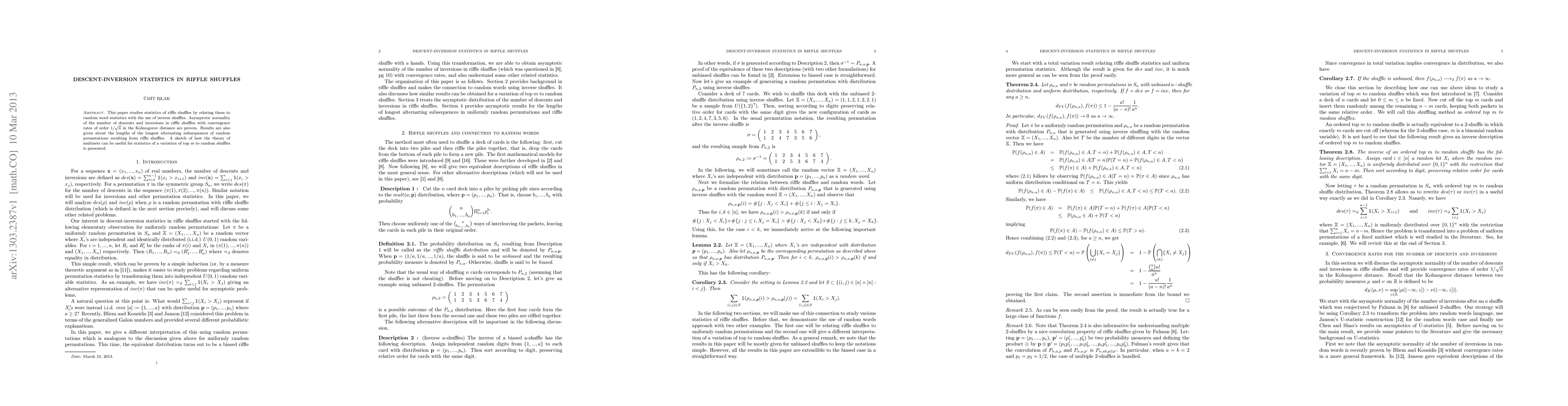This paper investigates descent-inversion statistics in riffle shuffles, proving their asymptotic normality with convergence rates of $1/\sqrt{n}$ and explores longest alternating subsequences in resulting permutations, while hinting at multiset theory's potential in top $m$ statistic analysis.
