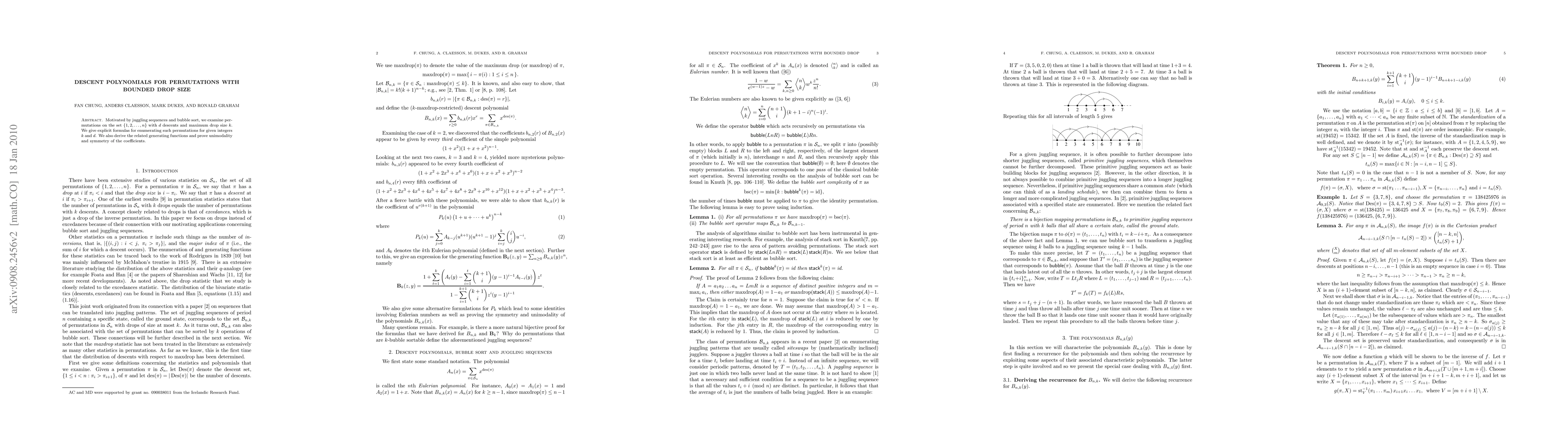 Motivated by juggling sequences and bubble sort, we examine permutations on the set {1,2,...,n} with d descents and maximum drop size k. We give explicit formulas for enumerating such permutations for given integers k and d. We also derive the related generating functions and prove unimodality and symmetry of the coefficients.