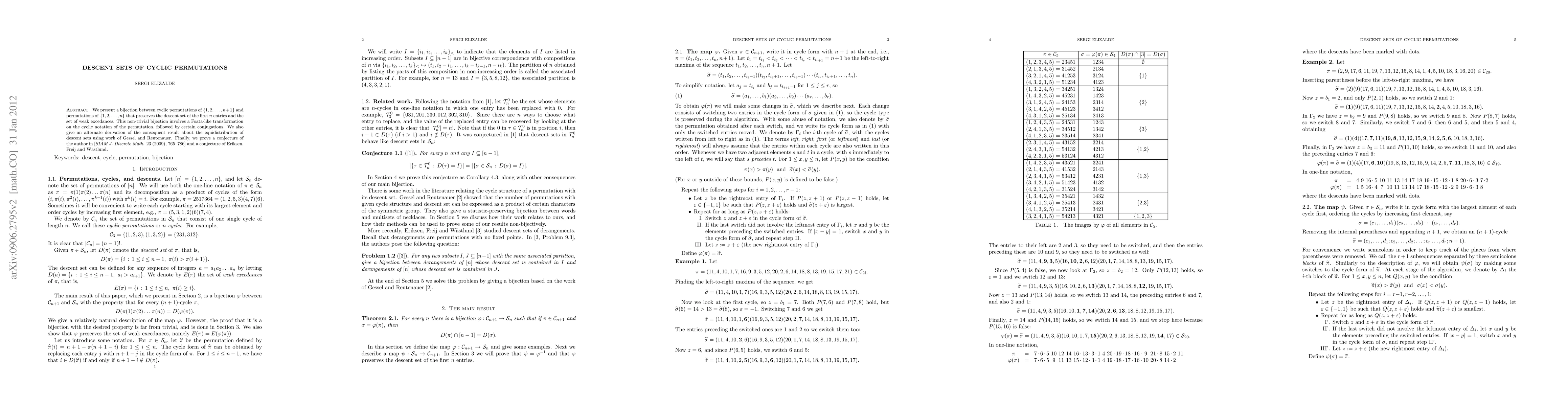This paper establishes a bijection between cyclic permutations of {1,2,...,n+1} and permutations of {1,2,...,n}, preserving descent sets and weak excedances. It also provides an alternate derivation for the equidistribution of descent sets and proves several conjectures.