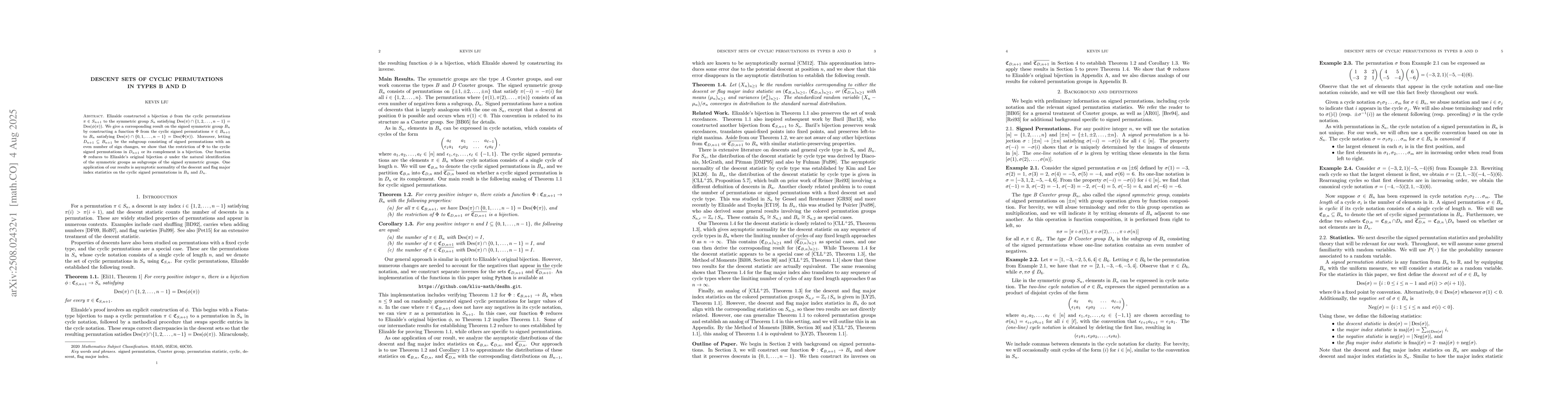 Elizalde constructed a bijection $\phi$ from the cyclic permutations $\pi\in S_{n+1}$ to the symmetric group $S_n$ satisfying $\operatorname{Des}(\pi)\cap \{1,2,\ldots,n-1\}=\operatorname{Des}(\phi(\pi))$. We give a corresponding result on the signed symmetric group $B_n$ by constructing a function $\Phi$ from the cyclic signed permutations $\pi\in B_{n+1}$ to $B_n$ satisfying $\operatorname{Des}(\pi)\cap \{0,1,\ldots,n-1\}=\operatorname{Des}(\Phi(\pi))$. Moreover, letting $D_{n+1}\subseteq B_{n+1}$ be the subgroup consisting of signed permutations with an even number of sign changes, we show that the restriction of $\Phi$ to the cyclic signed permutations in $D_{n+1}$ or its complement is a bijection. Our function $\Phi$ reduces to Elizalde's original bijection $\phi$ under the natural identification of the symmetric groups as subgroups of the signed symmetric groups. One application of our results is asymptotic normality of the descent and flag major index statistics on the cyclic signed permutations in $B_{n}$ and $D_n$.