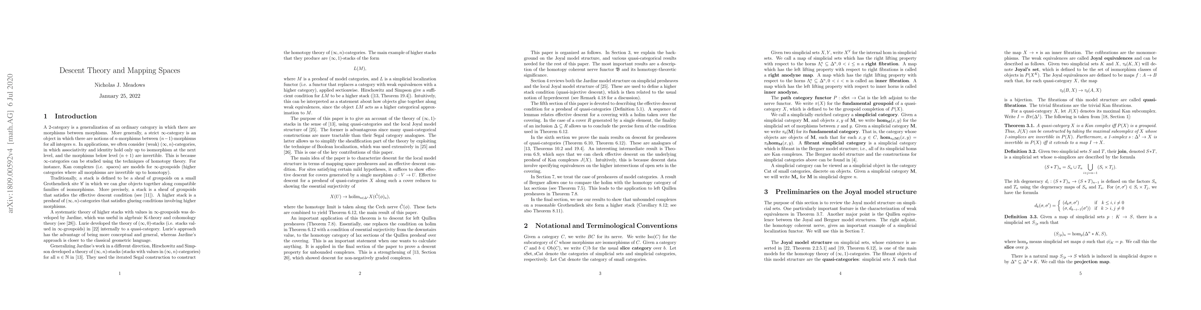 The purpose of this paper is to develop a theory of $(\infty, 1)$-stacks, in the sense of Hirschowitz-Simpson's `Descent Pour Les n-Champs', using the language of quasi-category theory and the author's local Joyal model structure. The main result is a characterization of $(\infty, 1)$-stacks in terms of mapping space presheaves. An important special case of this theorem gives a sufficient condition for the presheaf of quasi-categories associated to a presheaf of model categories to be a higher stack. In the final section, we apply this result to construct the higher stack of unbounded complexes associated to a ringed site.