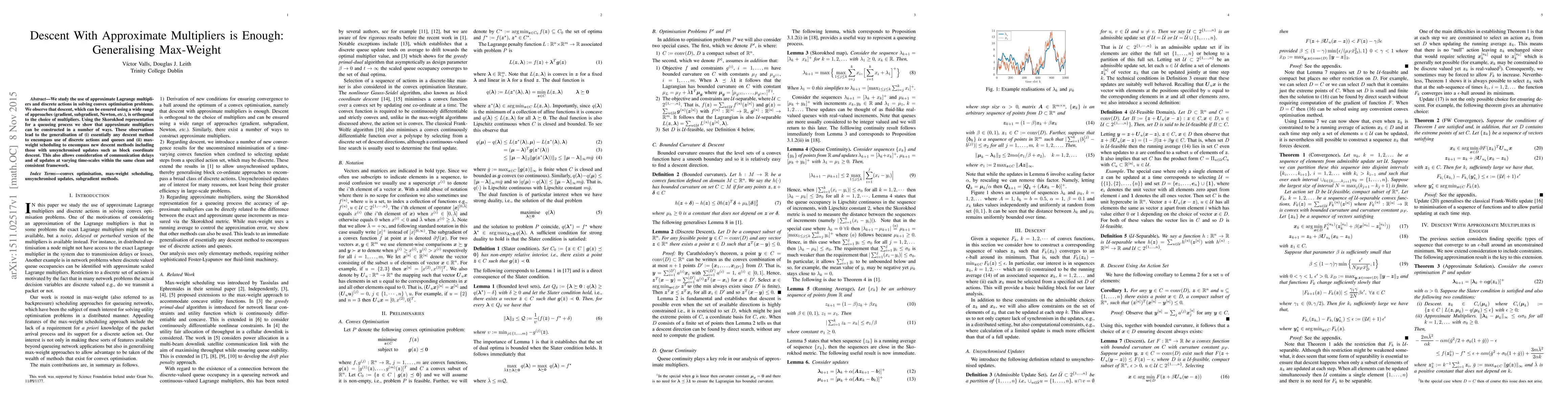 We study the use of approximate Lagrange multipliers and discrete actions in solving convex optimisation problems. We observe that descent, which can be ensured using a wide range of approaches (gradient, subgradient, Newton, etc.), is orthogonal to the choice of multipliers. Using the Skorokhod representation for a queueing process we show that approximate multipliers can be constructed in a number of ways. These observations lead to the generalisation of (i) essentially any descent method to encompass use of discrete actions and queues and (ii) max-weight scheduling to encompass new descent methods including those with unsynchronised updates such as block coordinate descent. This also allows consideration of communication delays and of updates at varying time-scales within the same clean and consistent framework.