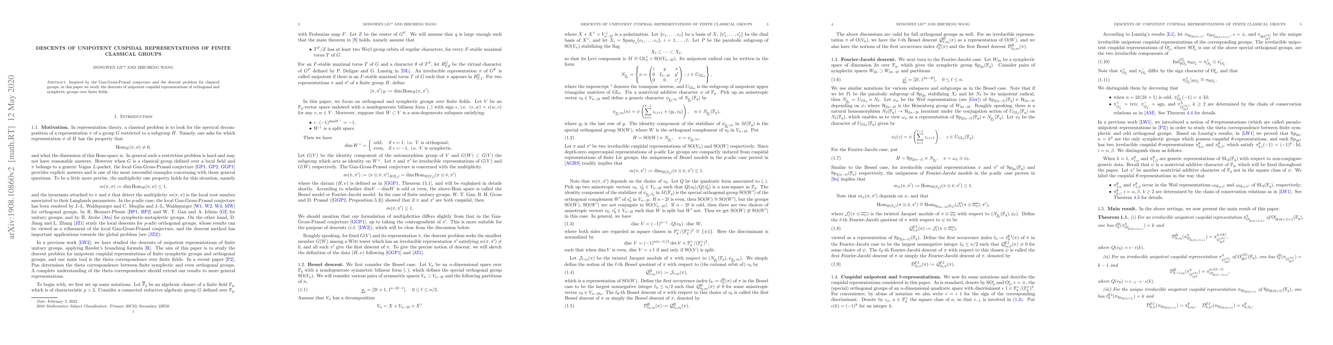 This paper investigates the descents of unipotent cuspidal representations for orthogonal and symplectic groups over finite fields, motivated by the Gan-Gross-Prasad conjecture and the descent problem for classical groups.