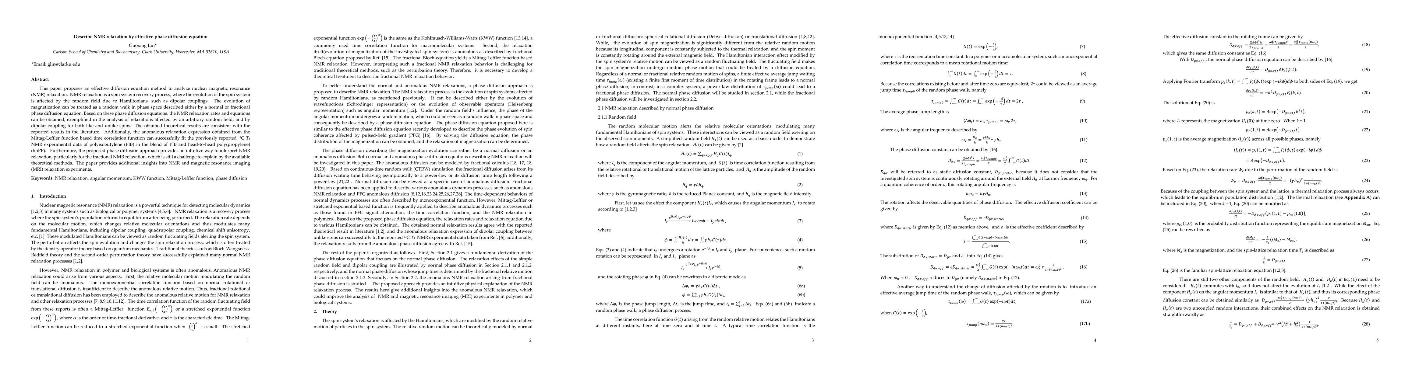 The paper introduces an effective diffusion equation method for analyzing NMR relaxation, providing relaxation rates and equations for simple random fields and dipolar coupling.