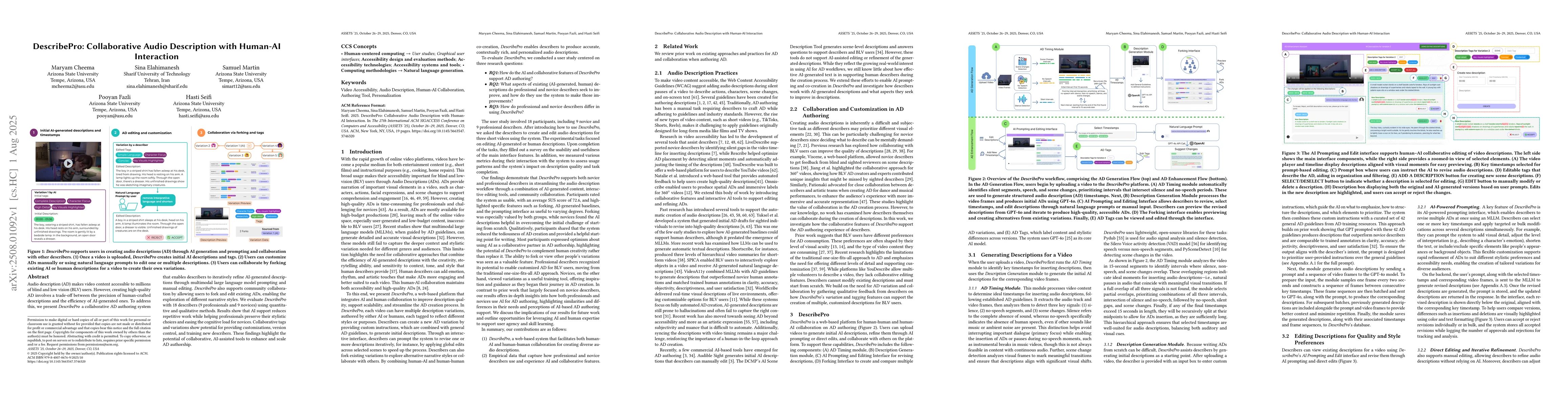 Audio description (AD) makes video content accessible to millions of blind and low vision (BLV) users. However, creating high-quality AD involves a trade-off between the precision of human-crafted descriptions and the efficiency of AI-generated ones. To address this, we present DescribePro a collaborative AD authoring system that enables describers to iteratively refine AI-generated descriptions through multimodal large language model prompting and manual editing. DescribePro also supports community collaboration by allowing users to fork and edit existing ADs, enabling the exploration of different narrative styles. We evaluate DescribePro with 18 describers (9 professionals and 9 novices) using quantitative and qualitative methods. Results show that AI support reduces repetitive work while helping professionals preserve their stylistic choices and easing the cognitive load for novices. Collaborative tags and variations show potential for providing customizations, version control, and training new describers. These findings highlight the potential of collaborative, AI-assisted tools to enhance and scale AD authorship.