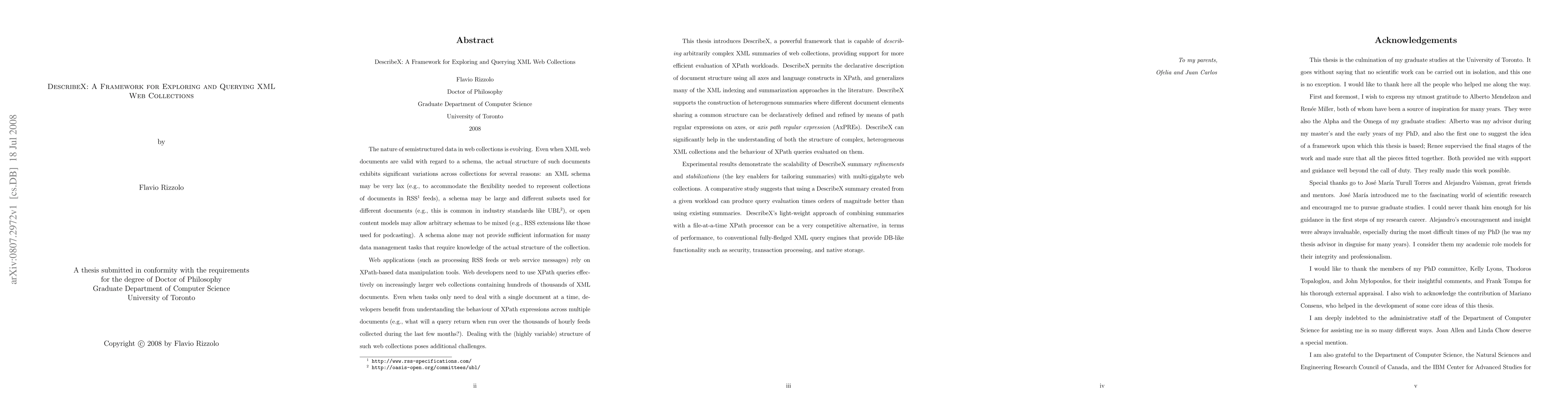 DescribeX is a framework for describing and querying complex XML web collections, enabling efficient XPath workload evaluation through scalable summary refinements. It outperforms existing summaries in query evaluation times, offering a lightweight alternative to traditional XML query engines.