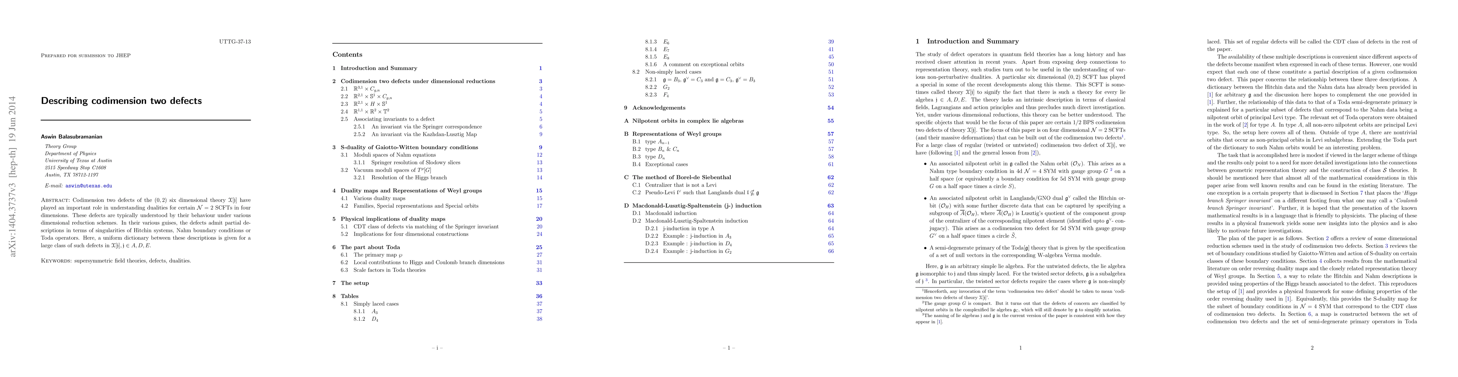 Codimension two defects of the $(0,2)$ six dimensional theory $\mathscr{X}[\mathfrak{j}]$ have played an important role in the understanding of dualities for certain $\mathcal{N}=2$ SCFTs in four dimensions. These defects are typically understood by their behaviour under various dimensional reduction schemes. In their various guises, the defects admit partial descriptions in terms of singularities of Hitchin systems, Nahm boundary conditions or Toda operators. Here, a uniform dictionary between these descriptions is given for a large class of such defects in $\mathscr{X}[\mathfrak{j}], \mathfrak{j} \in A,D,E$.