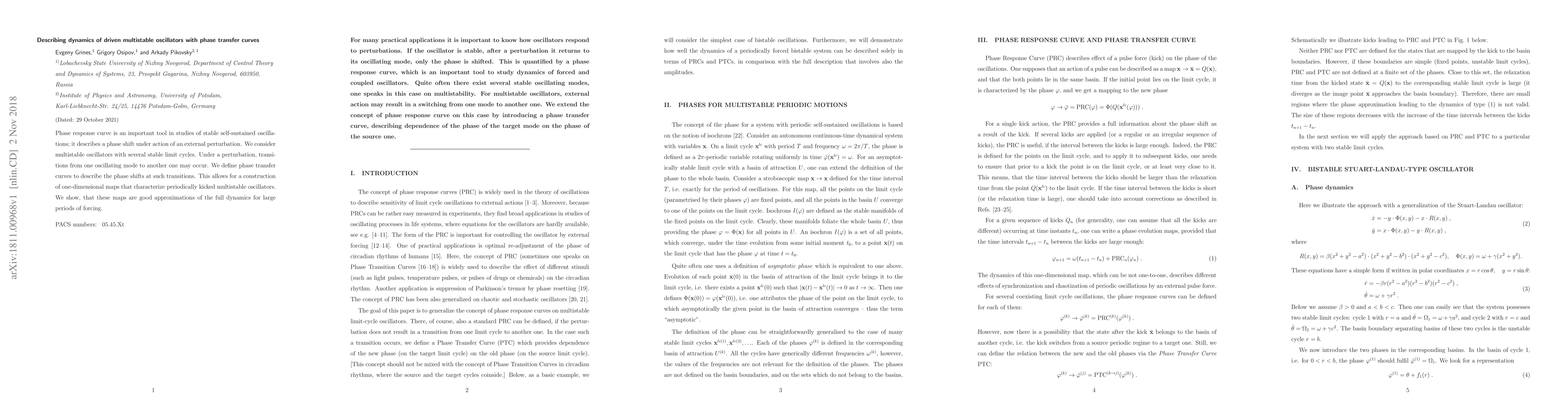 This paper introduces phase transfer curves to describe transitions between stable limit cycles in driven multistable oscillators, constructing one-dimensional maps that approximate the full dynamics under periodic forcing for large forcing periods.