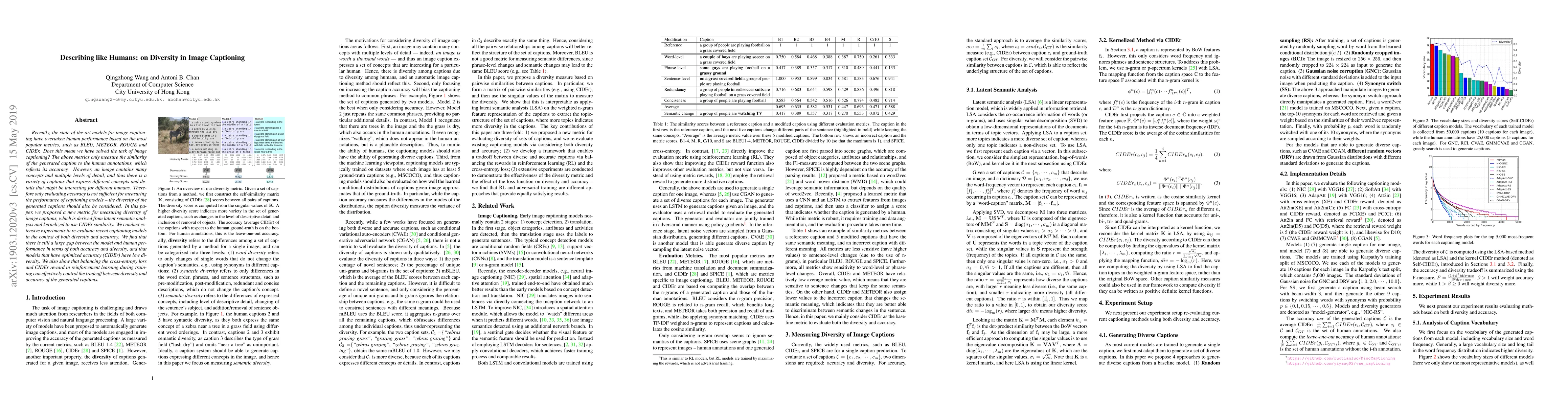 This paper proposes a new metric to evaluate the diversity of image captions in addition to traditional accuracy metrics. It finds that current models excel in accuracy but lag in generating diverse captions, highlighting the need for balancing accuracy and diversity in training methods.