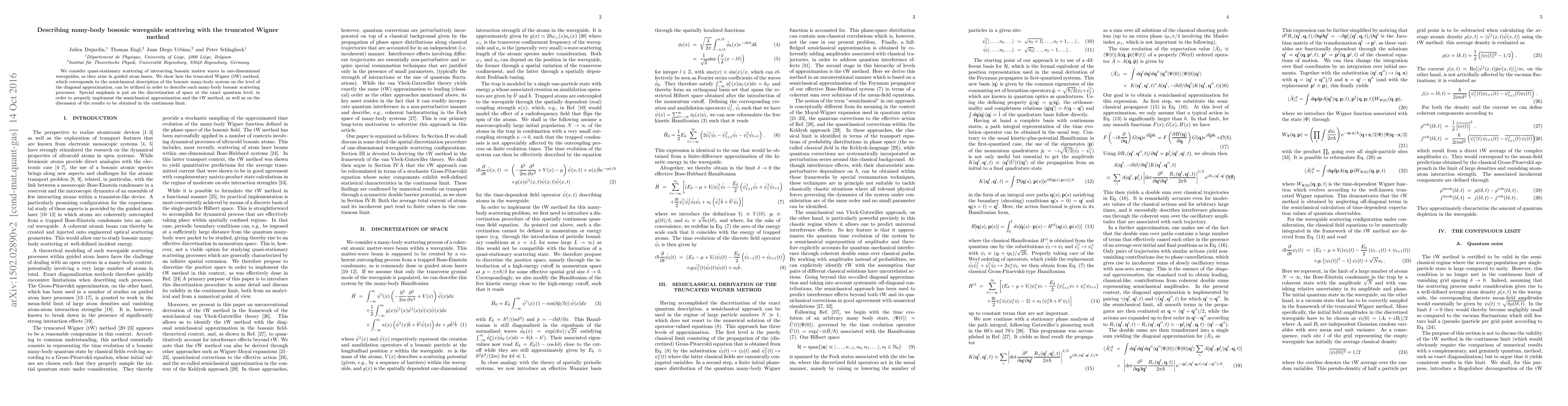 We consider quasi-stationary scattering of interacting bosonic matter waves in one-dimensional waveguides, as they arise in guided atom lasers. We show how the truncated Wigner (tW) method, which corresponds to the semiclassical description of the bosonic many-body system on the level of the diagonal approximation, can be utilized in order to describe such many-body bosonic scattering processes. Special emphasis is put on the discretization of space at the exact quantum level, in order to properly implement the semiclassical approximation and the tW method, as well as on the discussion of the results to be obtained in the continuous limit.