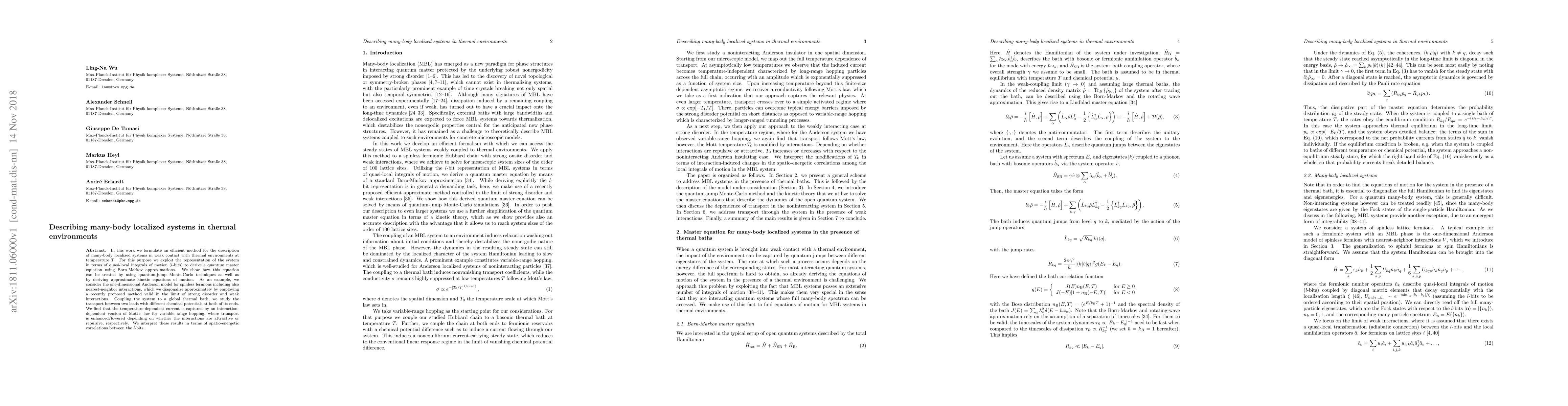In this work we formulate an efficient method for the description of many-body localized systems in weak contact with thermal environments at temperature $T$. For this purpose we exploit the representation of the system in terms of quasi-local integrals of motion ($l$-bits) to derive a quantum master equation using Born-Markov approximations. We show how this equation can be treated by using quantum-jump Monte-Carlo techniques as well as by deriving approximate kinetic equations of motion. As an example, we consider the one-dimensional Anderson model for spinless fermions including also nearest-neighbor interactions, which we diagonalize approximately by employing a recently proposed method valid in the limit of strong disorder and weak interactions. Coupling the system to a global thermal bath, we study the transport between two leads with different chemical potentials at both of its ends. We find that the temperature-dependent current is captured by an interaction-dependent version of Mott's law for variable range hopping, where transport is enhanced/lowered depending on whether the interactions are attractive or repulsive, respectively. We interpret these results in terms of spatio-energetic correlations between the $l$-bits.