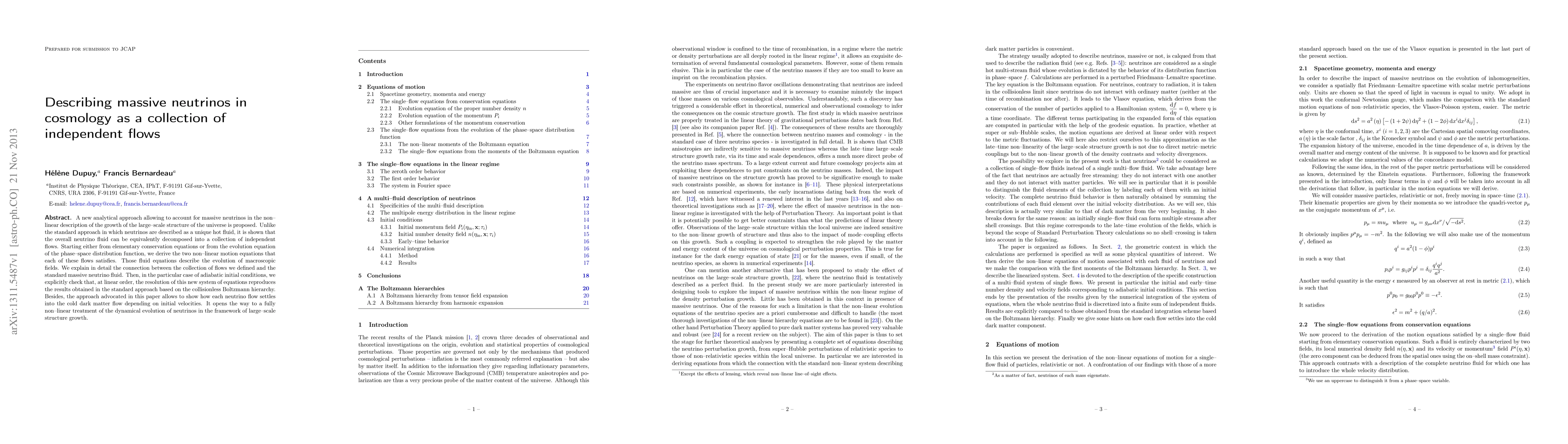 This paper proposes a novel analytical method to describe massive neutrinos in cosmology by decomposing the neutrino fluid into independent flows, rather than a single hot fluid. The new approach provides non-linear motion equations for these flows, offering a more detailed treatment of neutrino dynamics compared to the standard method.